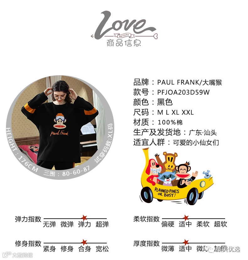 【限时秒杀】大嘴猴春秋季睡衣女纯棉长袖情侣男大码宽松薄款秋冬季家居服套装 原价:179元 VIP /黑卡M1会员 福利补贴价:139元 入秋微凉了,是该备上长袖睡衣裤。