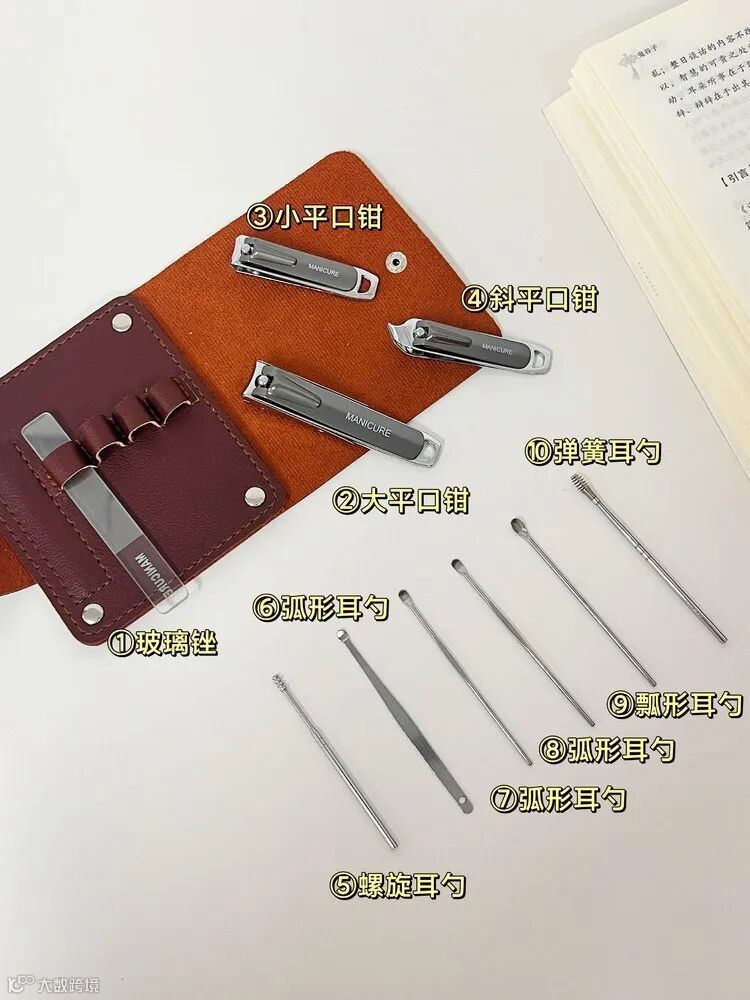 【产品清单】皮质收纳套、 玻璃锉、大平口钳、小平口钳、斜平口钳、弧形耳勺*3、螺旋耳勺、弹簧耳勺、瓢形耳勺