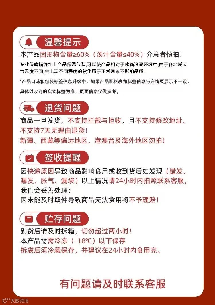 售后标准:食品类产品,不支持7天无理由退换货,产品下单发出后不支持撤单,拦截,拒收。介意者慎拍 !!!如收到货后发生撒漏、缺货、少货、变质等情况请立即拍照申请售后,请在24小时内,将快递面单和到手实物图一起拍下联系客服反馈售后,超时不处理,请理解。