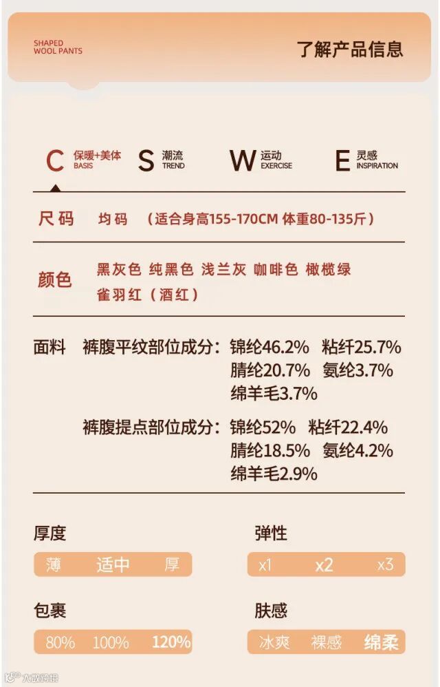 裤腹提点部位 锦纶52% 粘纤22.4% 腈纶18.5% 氨纶4.2% 绵羊毛2.9%