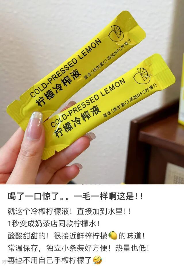 冷榨柠檬液采用整颗冷榨技术,更全面的保留了柠檬的营养,更不用说是浓缩柠檬汁。小小一袋就等于吃了好几颗柠檬了,好喝!好喝!!好喝!!!🤩