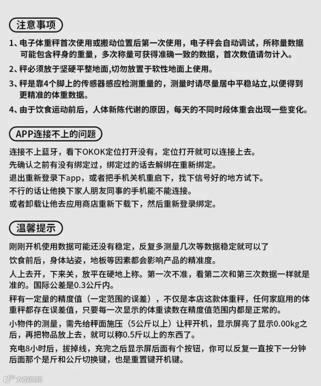 【产品清单】:体脂秤*1,USB充电线*1,说明书*1,皮尺*1