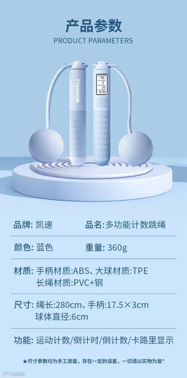 【规格】:绳长:280±0.5cm、手柄:17.5×3cm、球体直径:6cm