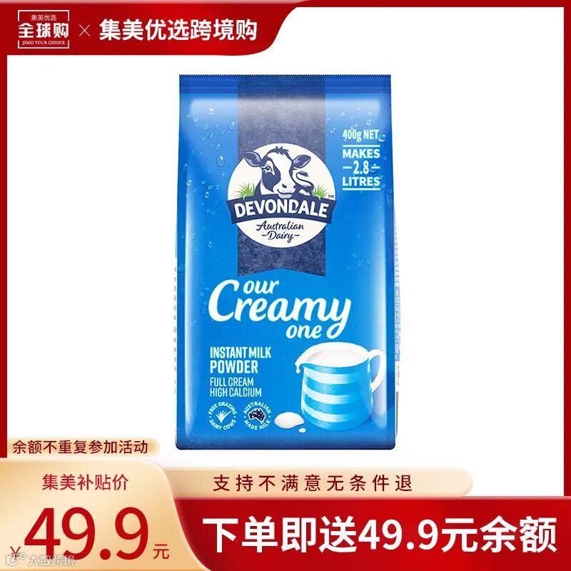 【试吃补贴】澳洲进口德运Devondale全脂奶粉400g/袋(25年5月)