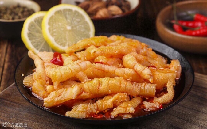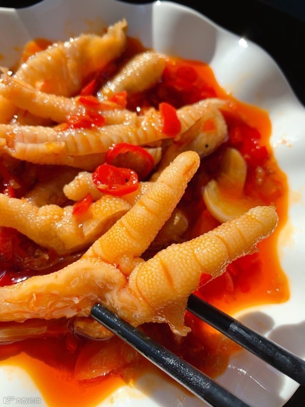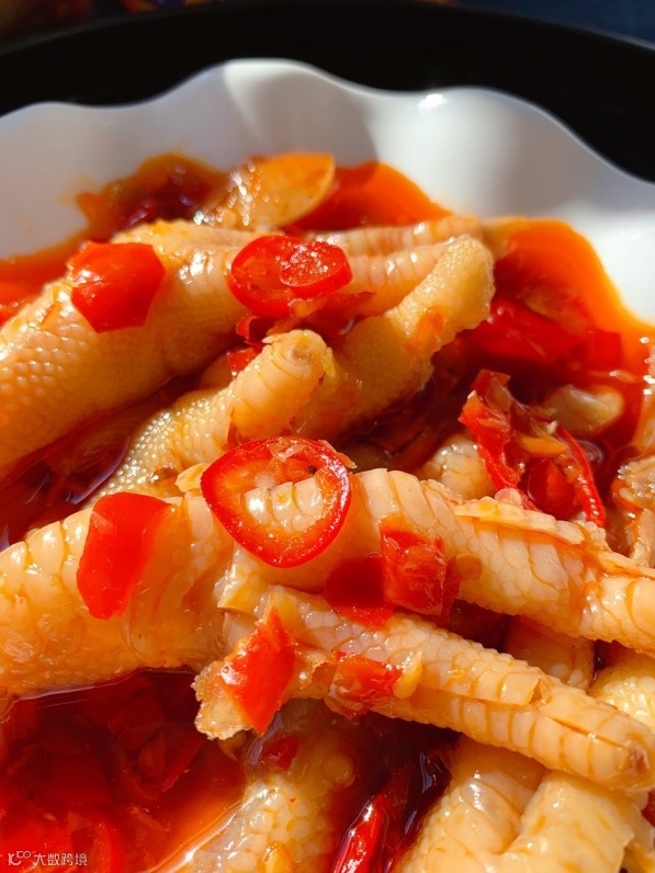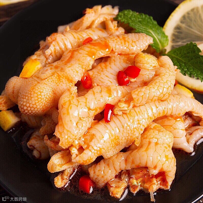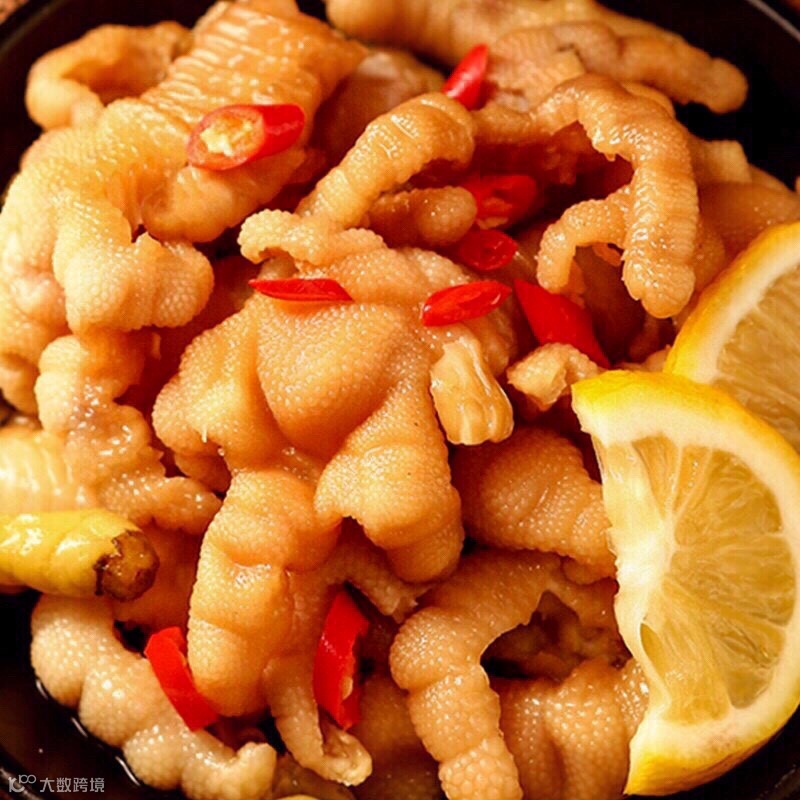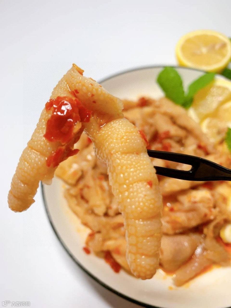 【配 料】去骨凤爪、笋丝、饮用水、食用盐、白砂糖、鸡精、陈醋、蚝油、麻油、红油、熟芝麻、柠檬、辣椒、胡椒、葡萄糖酸-δ-内酯、乳酸链球菌素、脱氢乙酸钠