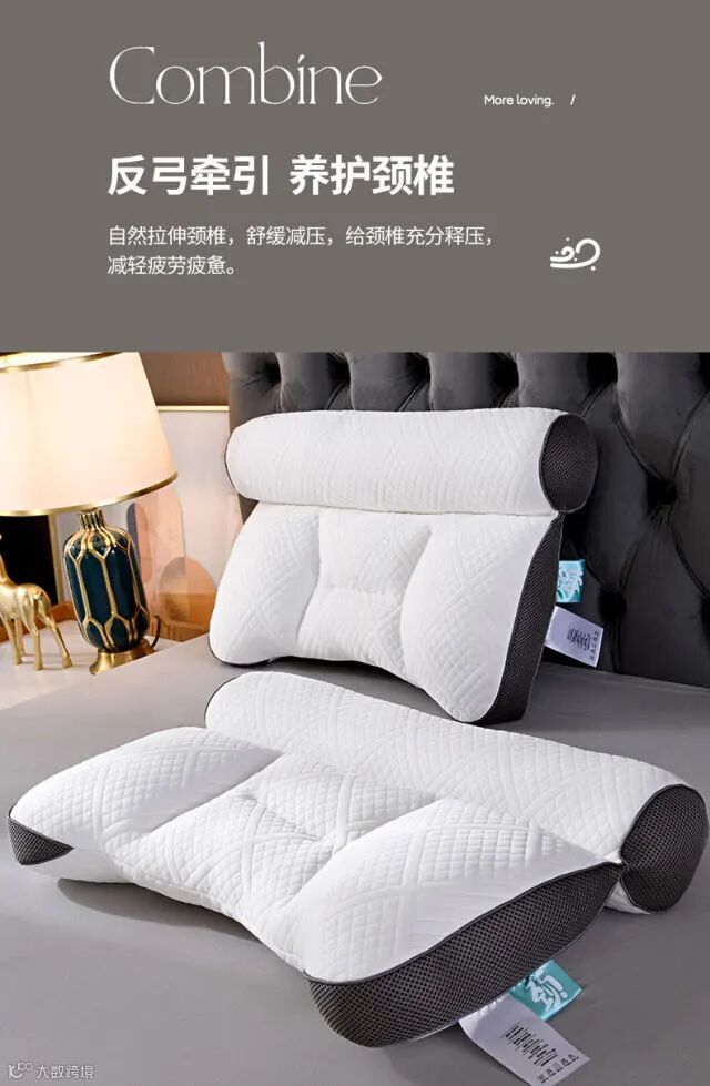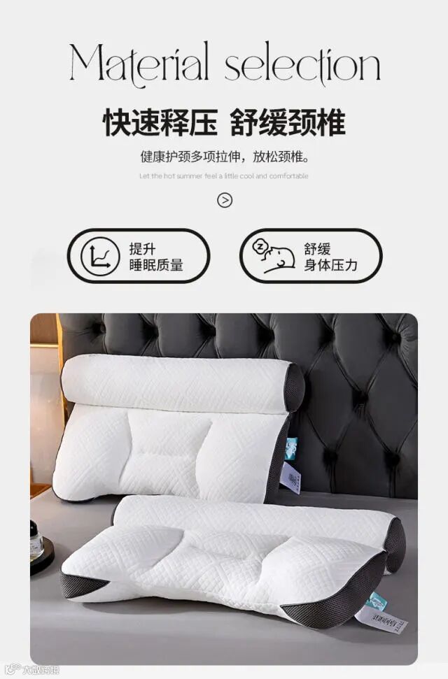 2、【独立分区设计】枕头形状5大分区,左右是侧睡支撑区,上部是后脑衬托区,中部 是头部衬托区,下部是颈部衬托区,分段设计,分区支撑,透气性好,回弹佳,更实用,满足不同睡姿;