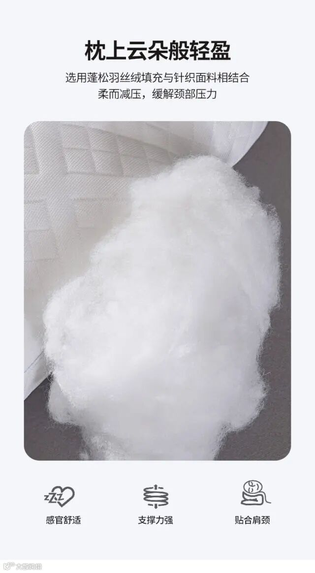 3、【仪征羽丝绒填充】科学配比,柔软蓬松,较好的抗压性,立体有型,不易结团,不易变形,经久耐用;
