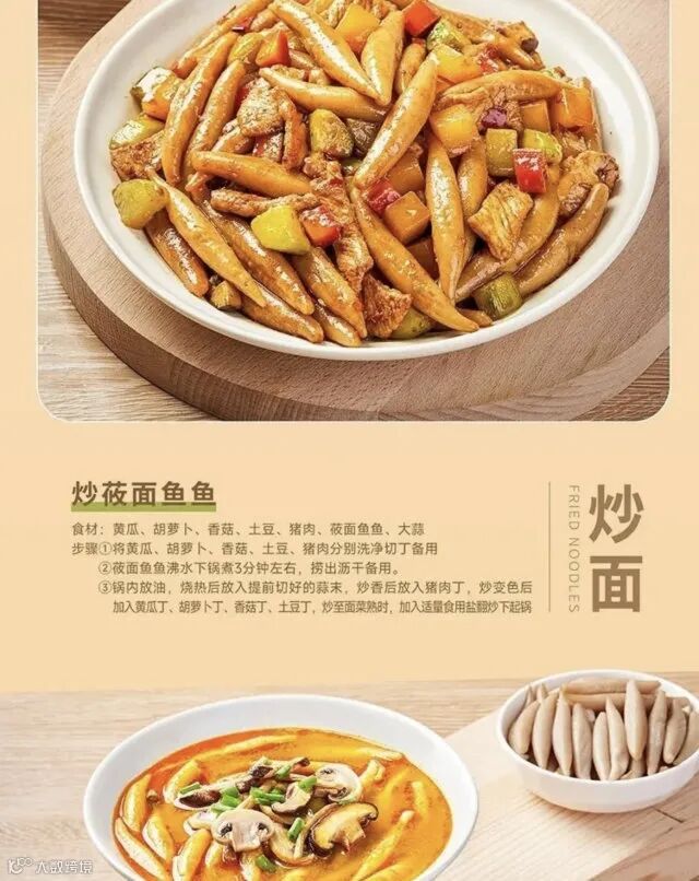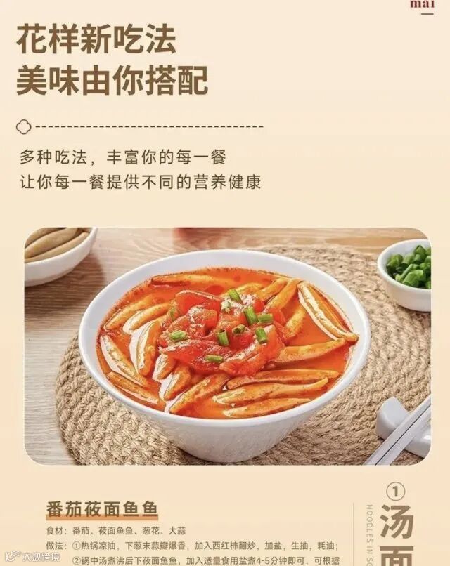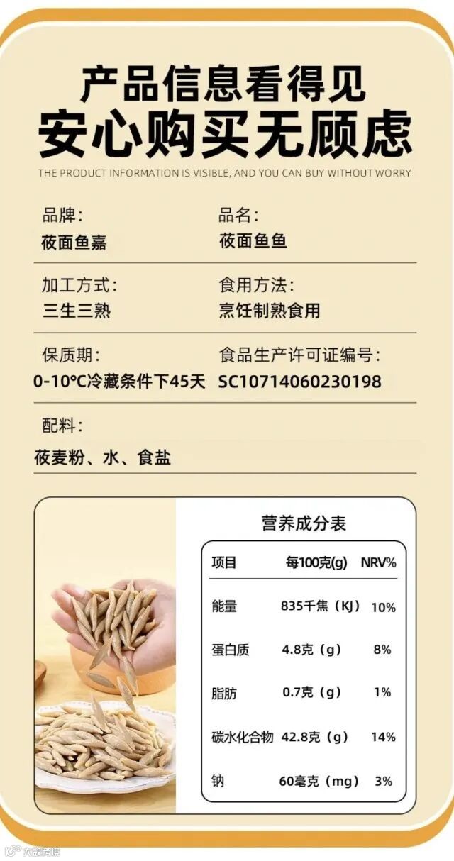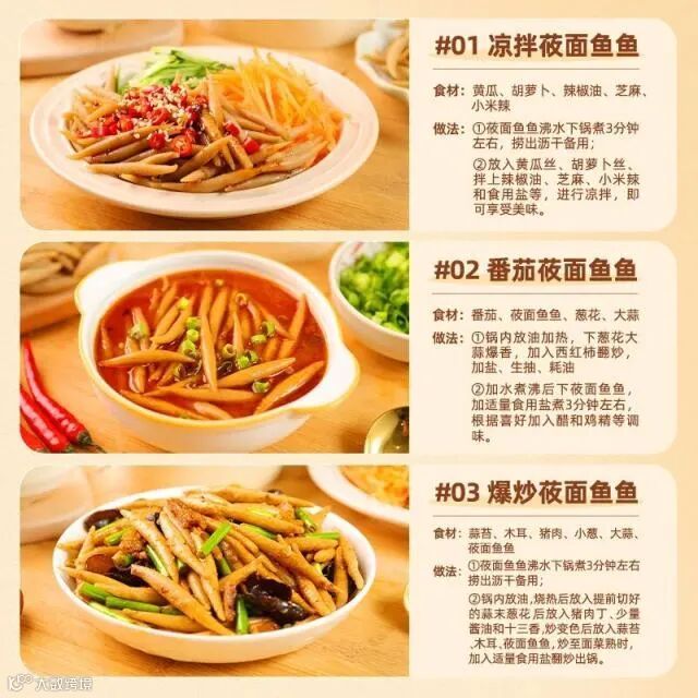 温馨提示]本品开袋后直接蒸热或加热即可,无需解冻面鱼分散方法:开袋将面鱼倒入沸水锅中,3~5分钟待鱼鱼分散以后,沥水备用
