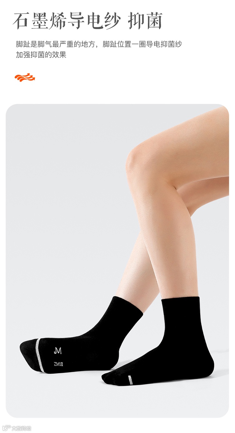 4.脚趾部分做石墨烯导电纱—— 脚趾是脚气最严重的地方 脚趾位置一圈导电抗菌纱,多重抗菌 来达到一个加强抑菌的效果