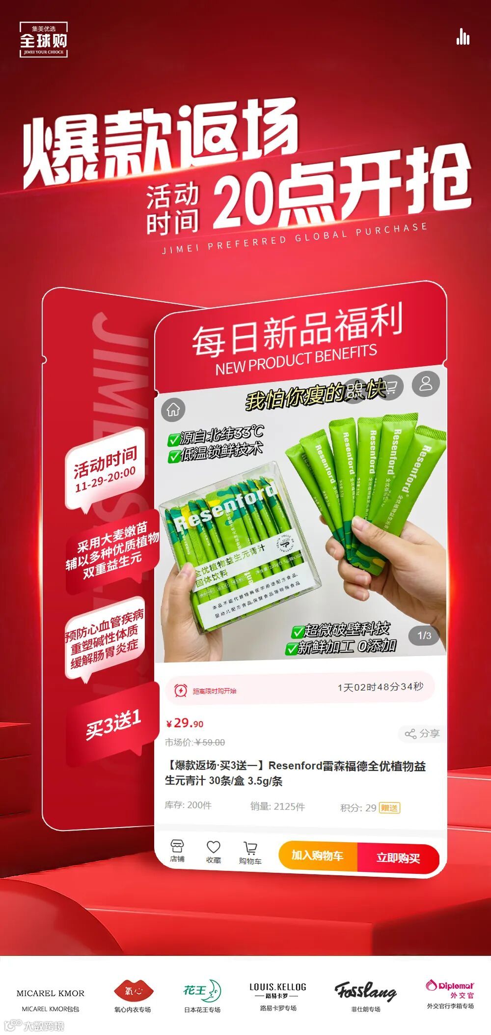 【爆款返场·买3送1】Resenford雷森福德全优植物益生元青汁 30条/盒 3.5g/条 原价:59元 粉丝群补贴价:29.9元
