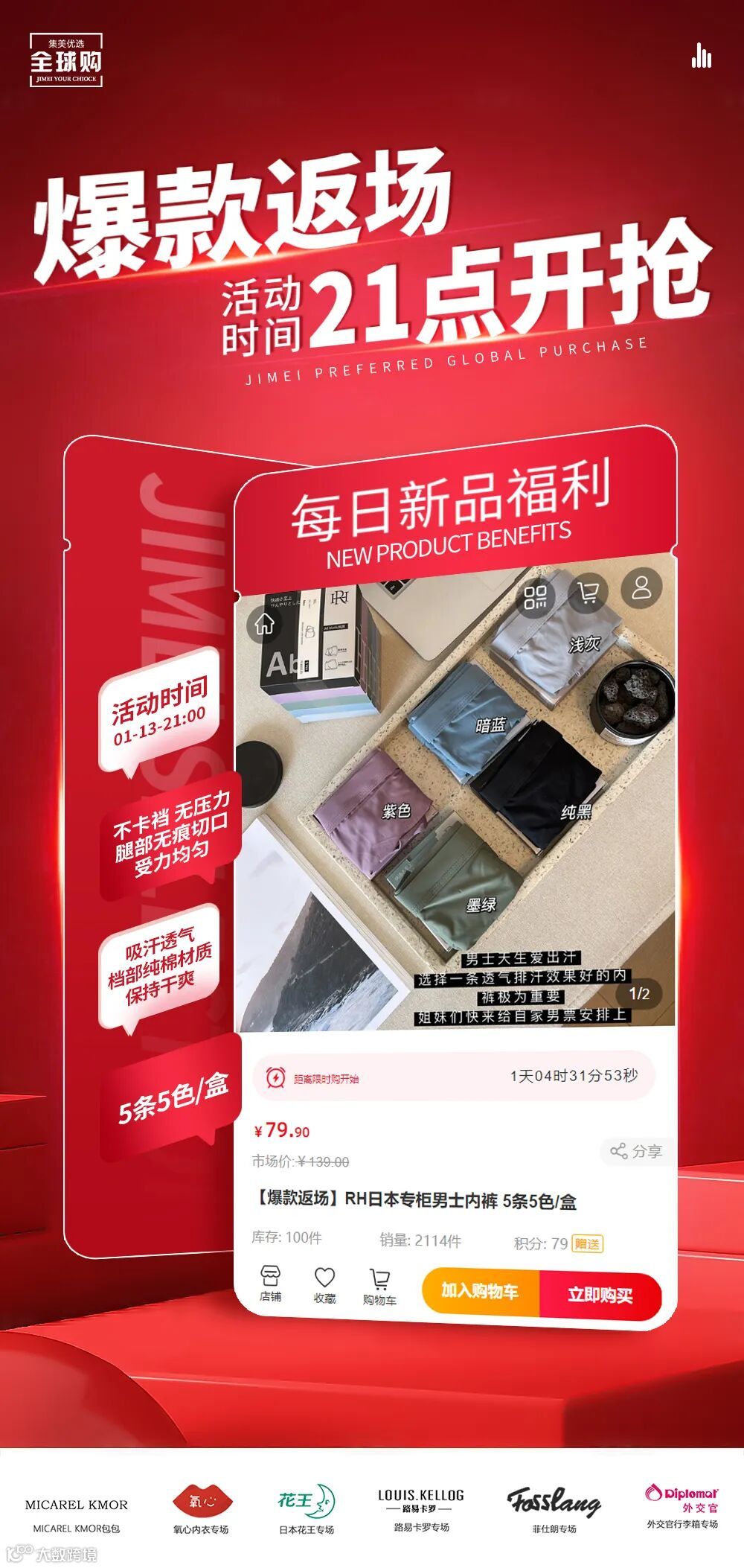 【爆款返场】RH日本专柜男士内裤 5条5色/盒 原价:139元 粉丝群补贴价:79.9元