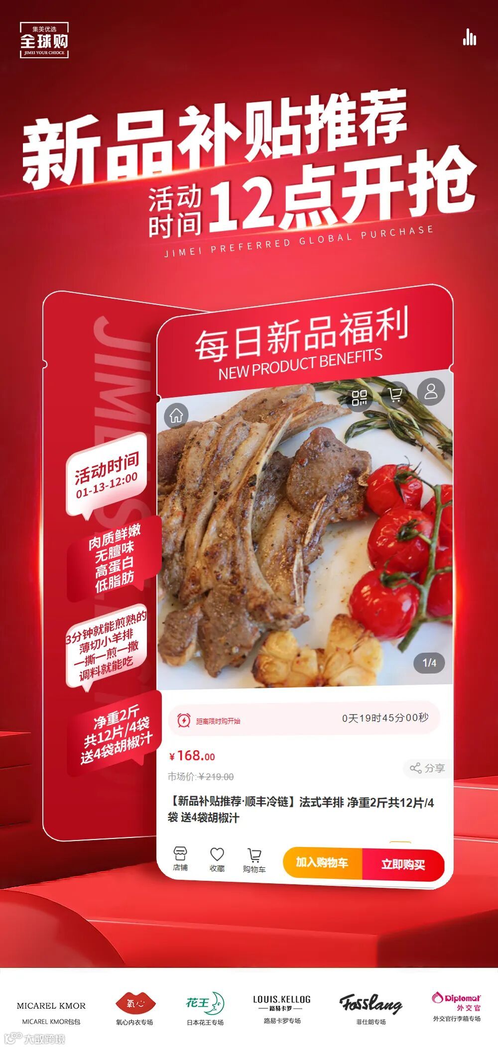 【新品补贴推荐·顺丰冷链】大法式羊排 净重2斤共12片/4袋 送4袋胡椒汁 原价:219元 粉丝群补贴价:168元