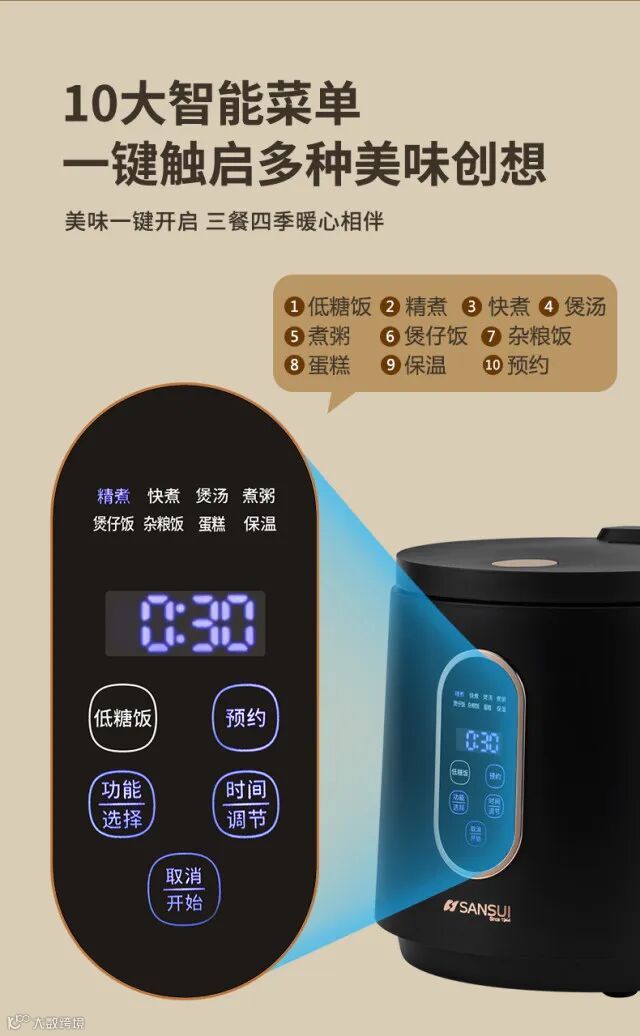 2、10大功能菜单、微压精煮技术、四位LED显示屏;