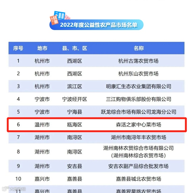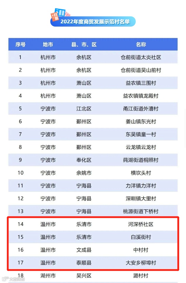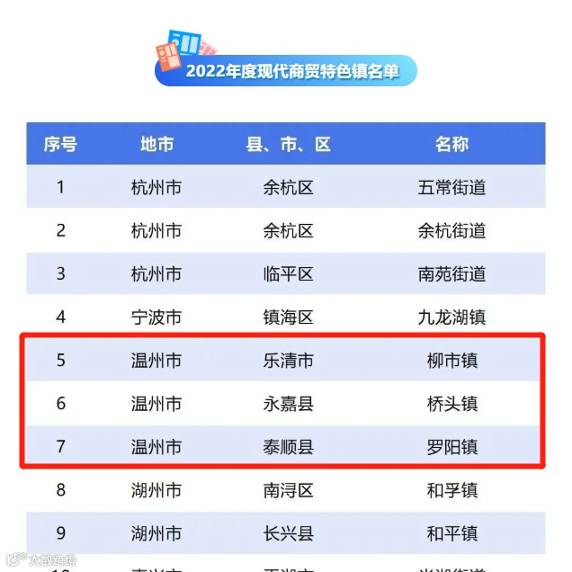 近日,浙江省商务厅公布2022年第三批现代商贸特色镇、商贸发展示范村、县域商业体系建设示范县等多项榜单,我市乐清柳市镇、永嘉桥头镇、泰顺罗阳镇等3个镇获评省现代商贸特色镇,乐清河深桥社区、乐清白溪街村、文成中村村、泰顺大安乡柳埠村等4个村获评省商贸发展示范村,瓯海森活之家中心菜市场获评省级公益性农产品市场,永嘉县、泰顺县列入2023年度浙江省县域商业体系建设示范县。