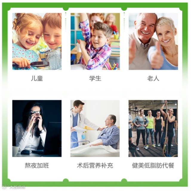 ●适宜人群:主要适用于日常膳食常用补充、孕妇、哺乳期妇女、老年人、不吃早餐者、控制体重者、运动员、体质虚弱、抵抗力低下者、等需要额外补充蛋白质者、病后康复者、营养不良、贫血、消化功能低下者