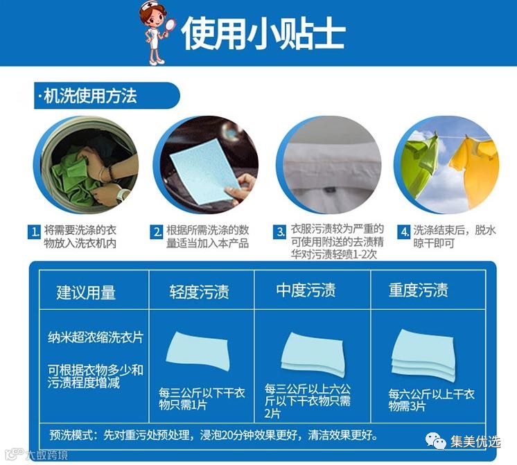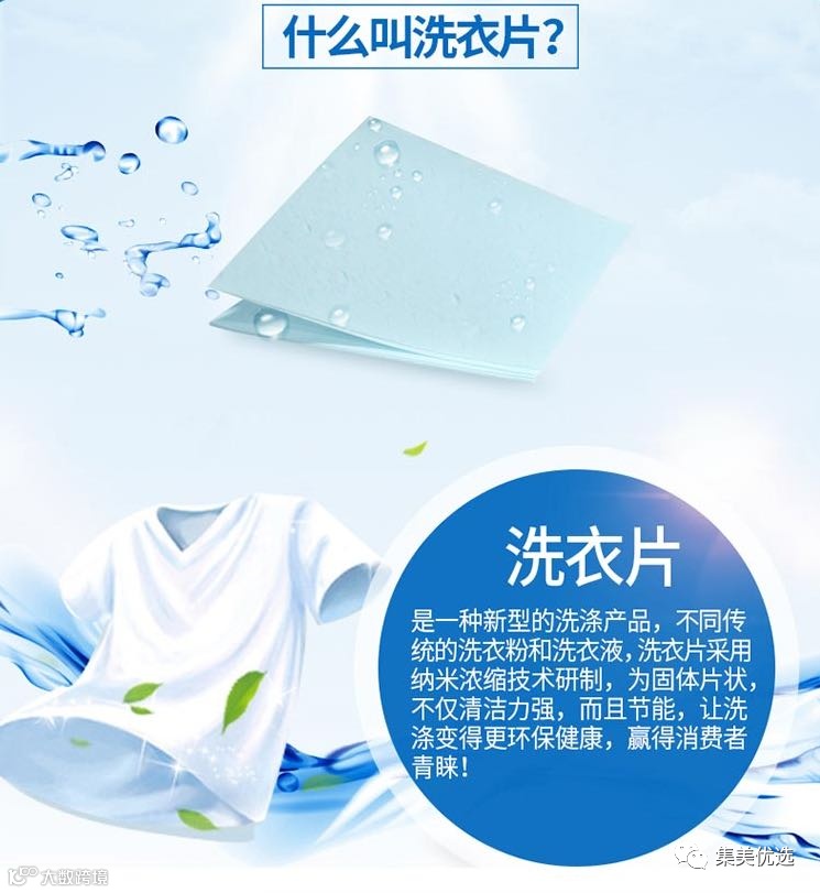 洗衣片带你走进洗衣新时代,简单一片就能洗3公斤衣物,清洗你一周的脏衣物。片状洗涤,轻巧易携,使用方便,告别传统袋装、瓶装洗衣产品。