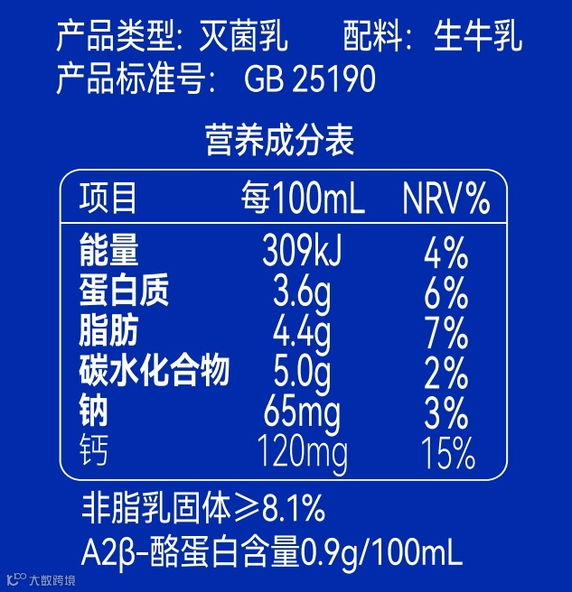 【主要指标】蛋白质3.6g/100mL;钙120mg/100mL