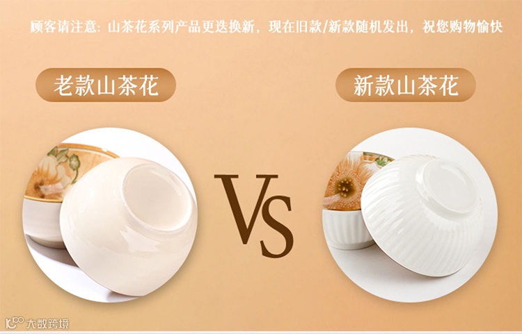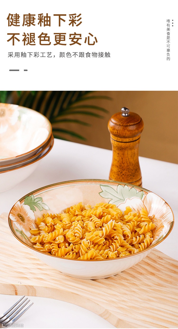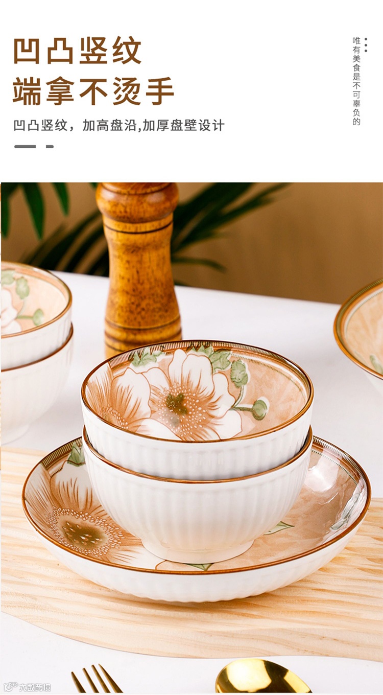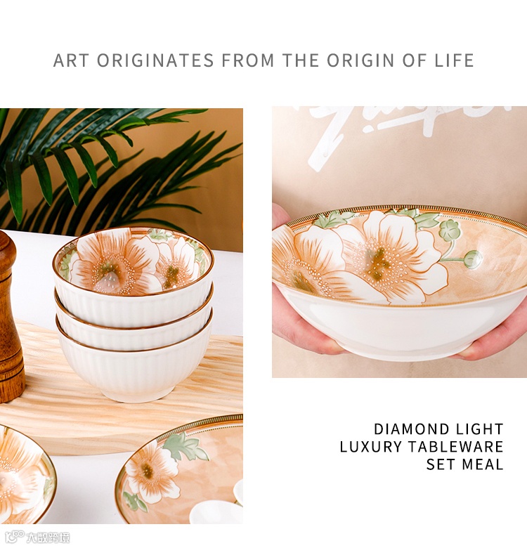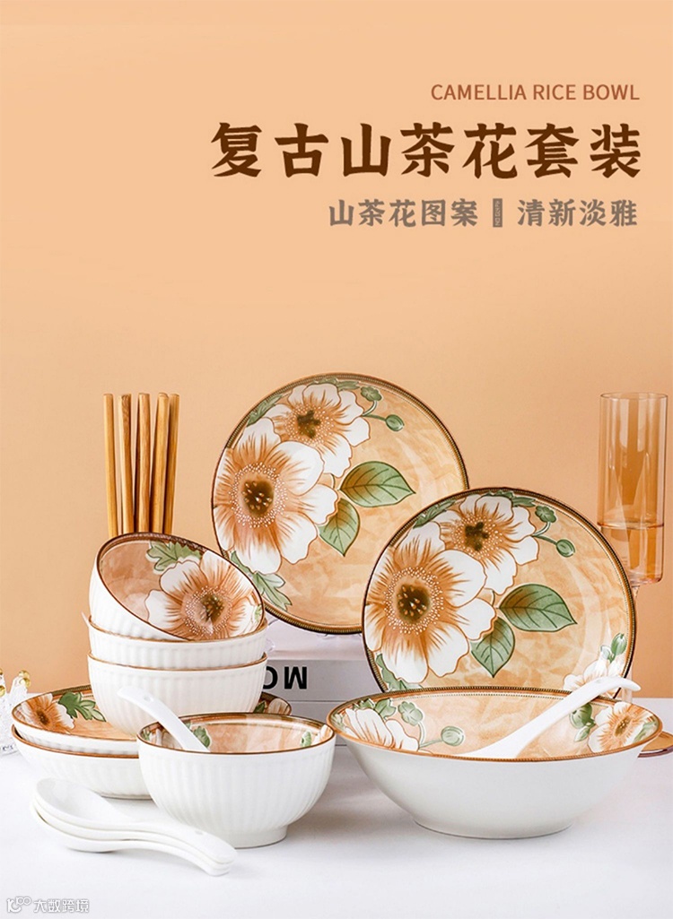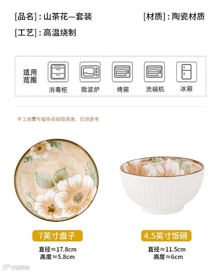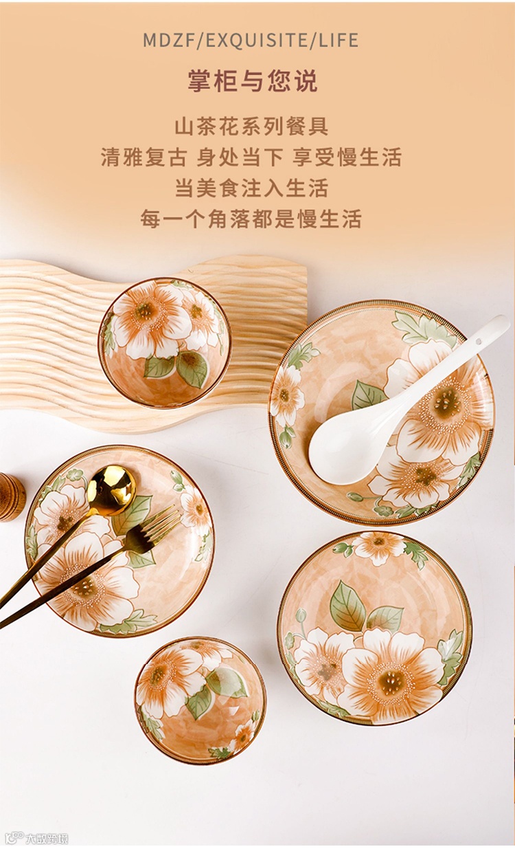 山茶花餐具 7英寸盘*4+4.5英寸碗*4+4小勺+4双筷子+2长柄勺(18件套)