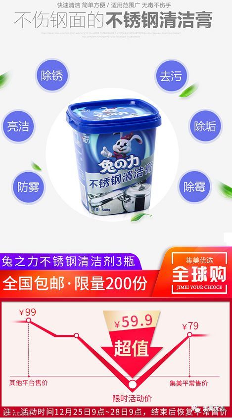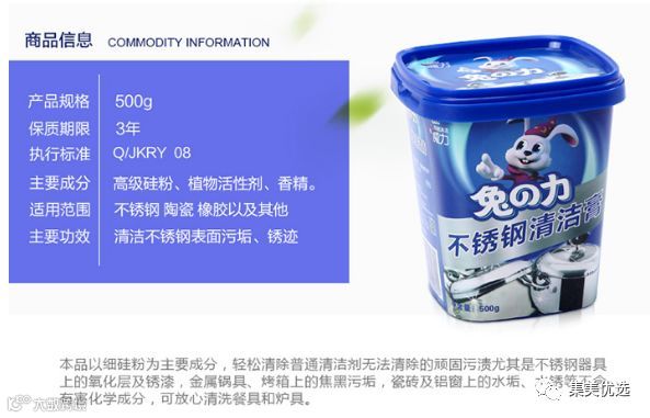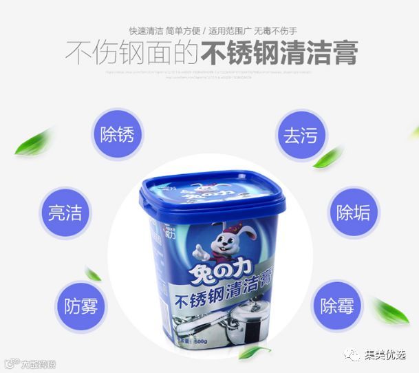 无毒无害无异味的兔之力清洁膏,强力去油污和锈迹,防雾防水珠,避免二次清洁。适用范围广泛,不伤手也不伤不锈钢,摆脱划痕,持久光亮如新,再也不用为清洁锈迹烦恼~