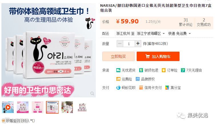 【福利团购】NARSIA/娜日舒韩国进口全棉无荧光剂超薄型卫生巾日夜用7盒组合装