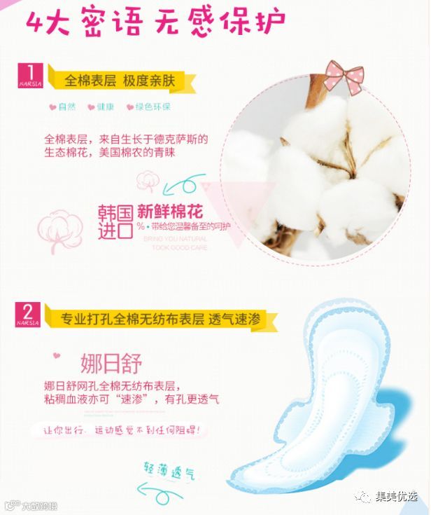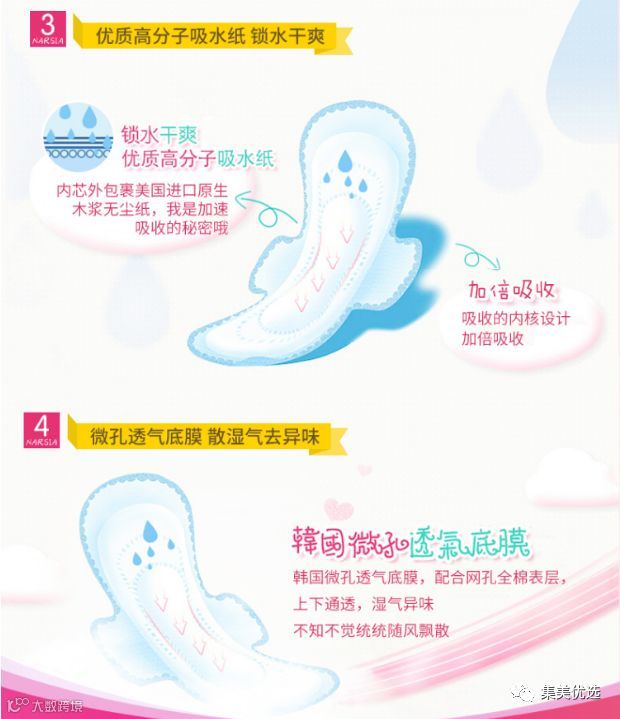 加上韩国专利技术微孔透气底膜,配合表层上的专业打孔,上下通透,粘稠血液亦可迅速渗透,真正将湿气异味散发出去,不潮湿不闷气,特别透气轻薄。