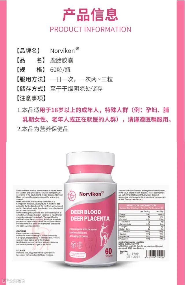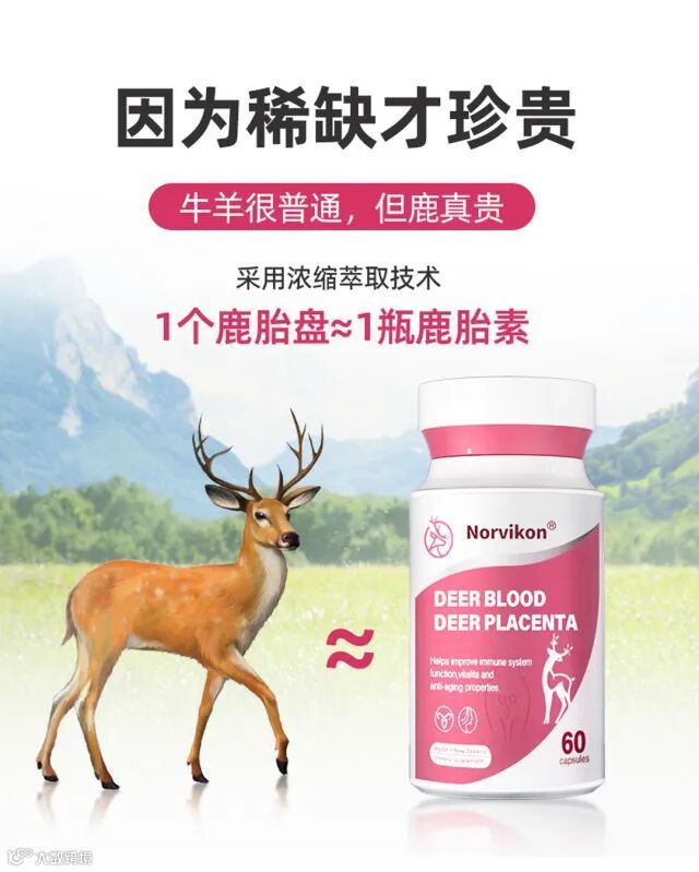 【粉丝群补贴】新西兰Norvikon鹿胎盘素胶囊60粒/盒 原价:219元 粉丝群补贴价:188元