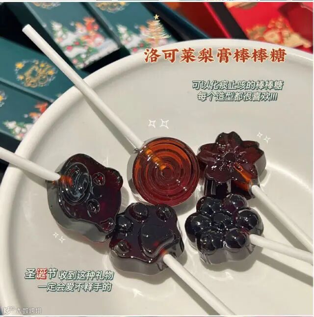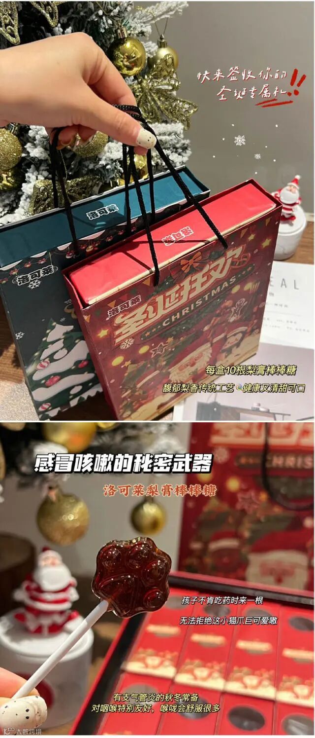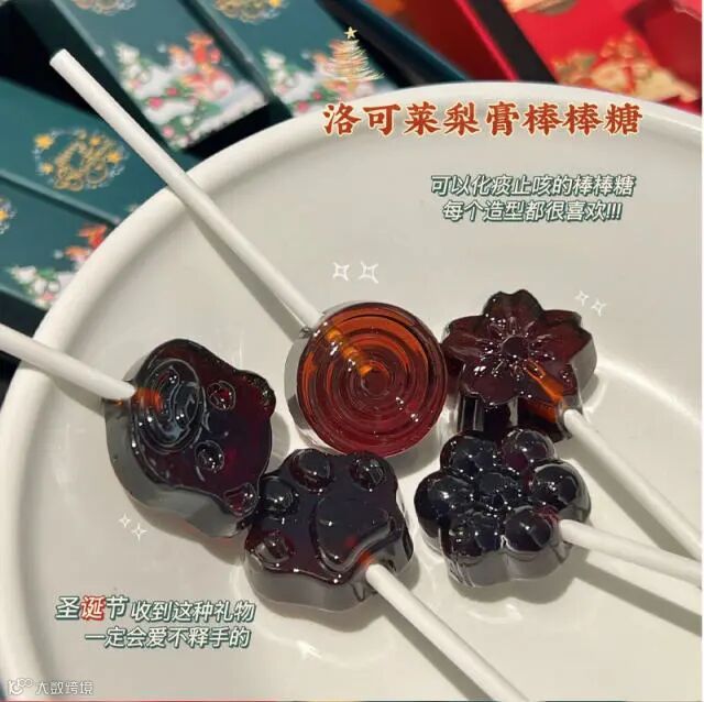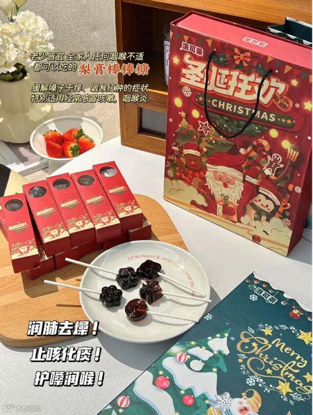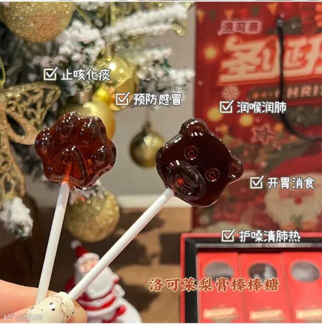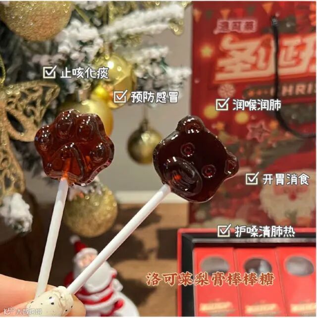 【 洛可莱圣诞梨膏棒棒糖】梨膏糖选用的中草药药性非常温和,副作用比较小,主要的作用是化痰止咳,可以辅助治疗咳嗽痰多、气管炎、哮喘等疾病,具有较好的疗效。
