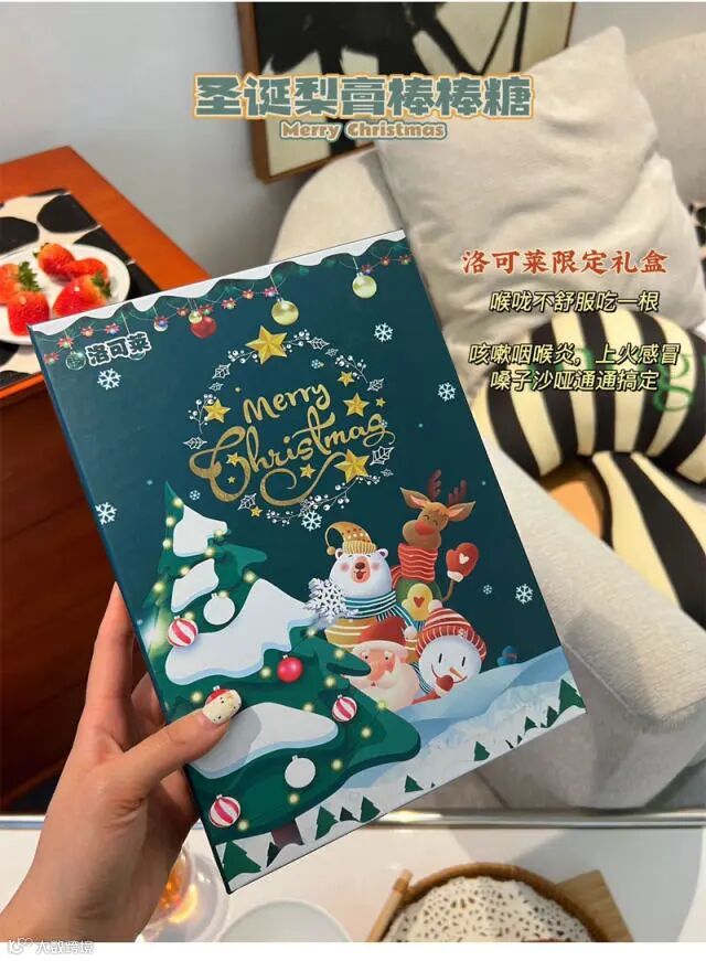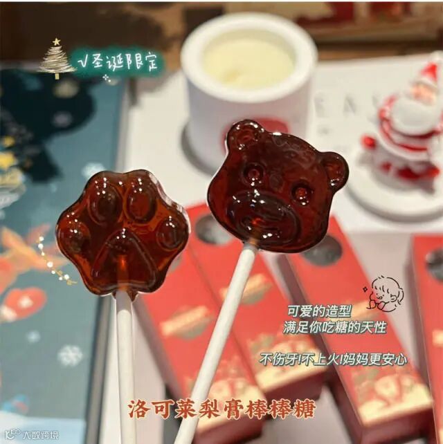 【 洛可莱圣诞梨膏棒棒糖】中医学认为梨膏糖味甘、性偏凉,主要归肺、胃二经,具有润肺清热、清胃泻热、养阴生津、滋肾补虚及润肠通便等作用,能缓解嗓子干痒、咽喉红肿的症状,其配方特色在于适用于感冒、抵抗力差的人群。