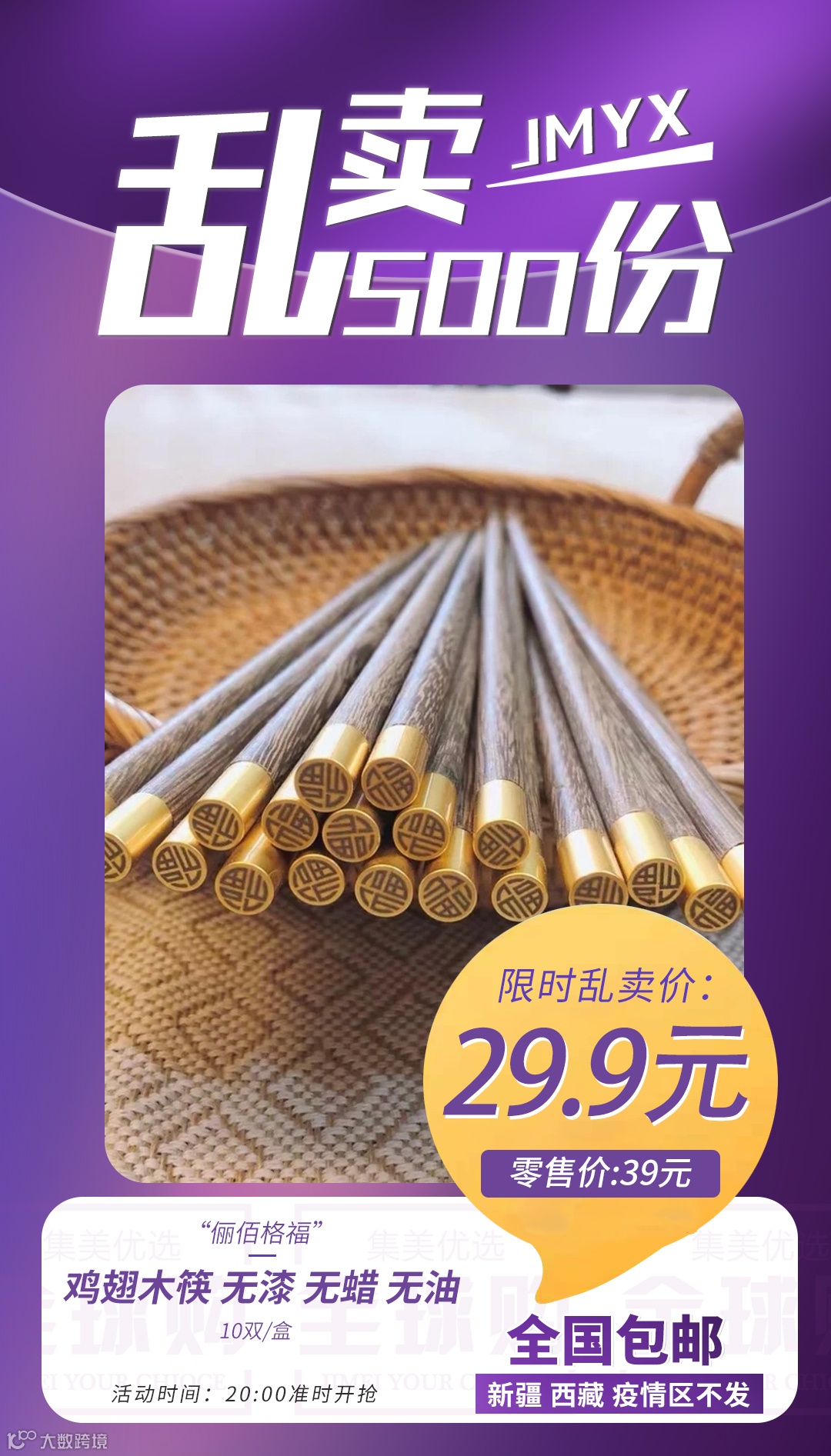 【粉丝群补贴】俪佰格福鸡翅木筷10双/盒 原价:39元 粉丝群补贴价:29.9元
