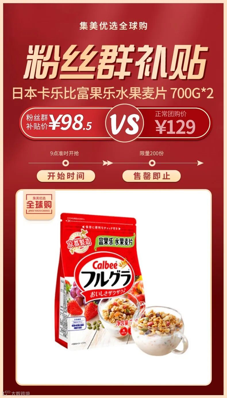 【粉丝群补贴】日本 Calbee/卡乐比富果乐水果麦片 700G*2袋(早餐谷物冲饮燕麦片) 原价:129元 粉丝群补贴价:98.5元
