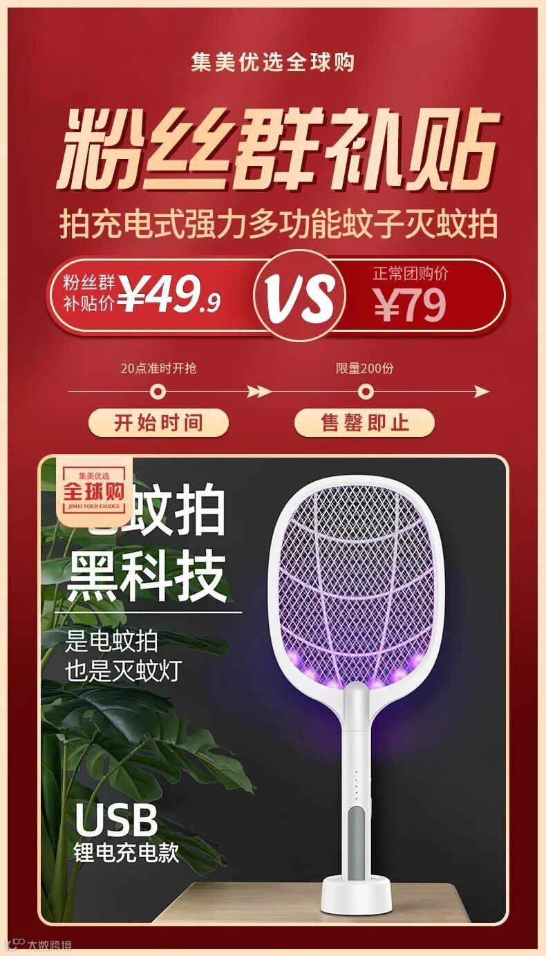 【粉丝群补贴】凯丽雅抖音网红灭蚊拍充电式强力二合一多功能蚊子灭蚊拍灭蚊灯两用 原价:79元 粉丝群补贴价:49.9元