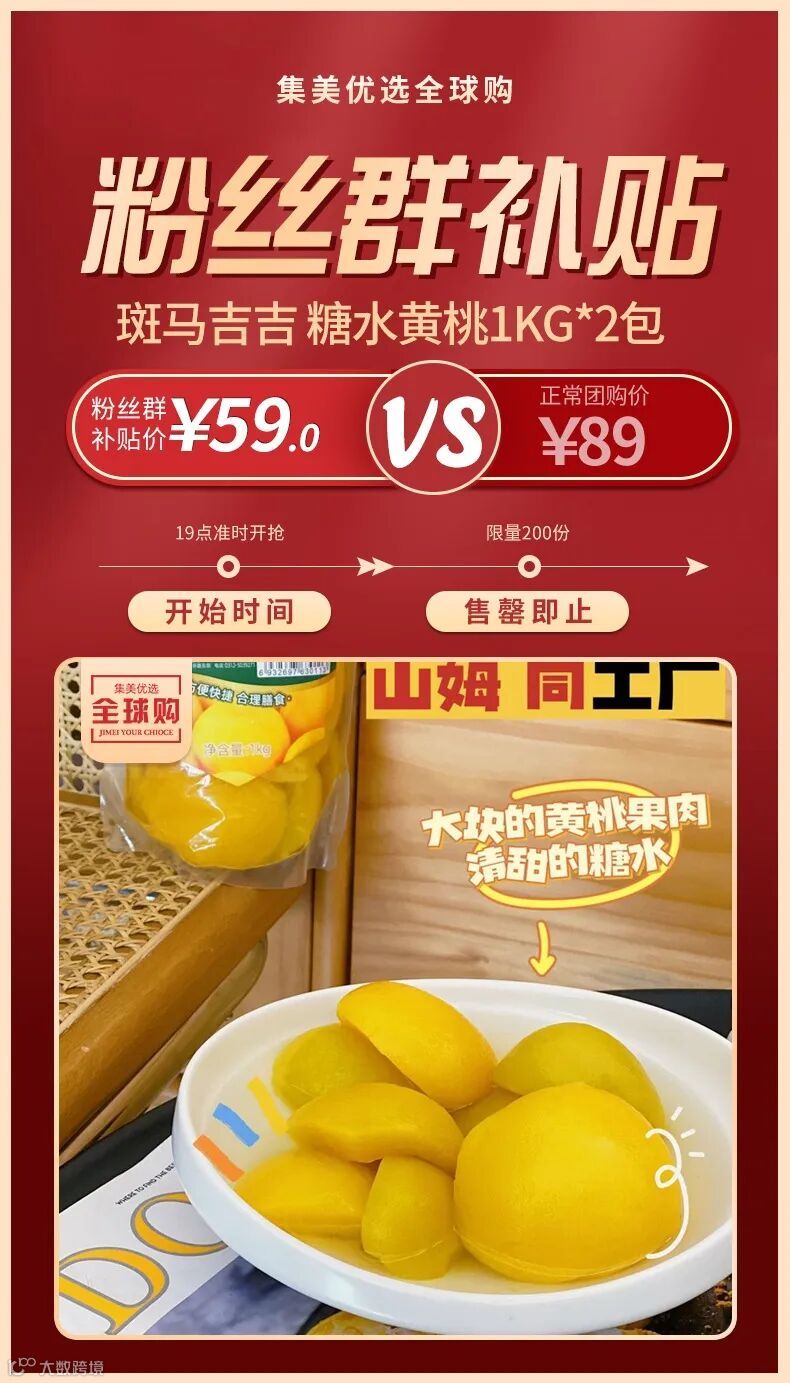 【粉丝群补贴】斑马吉吉 山姆同款糖水黄桃1kg*2包 原价:89元 粉丝群补贴价:59元