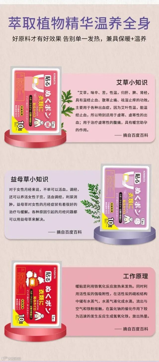 2.艾草贴是天然艾草提取精华,最大特点是具有驱寒的功效,加上铁粉的持续发热彻底,很好的做到驱寒保暖,男女老少通用。