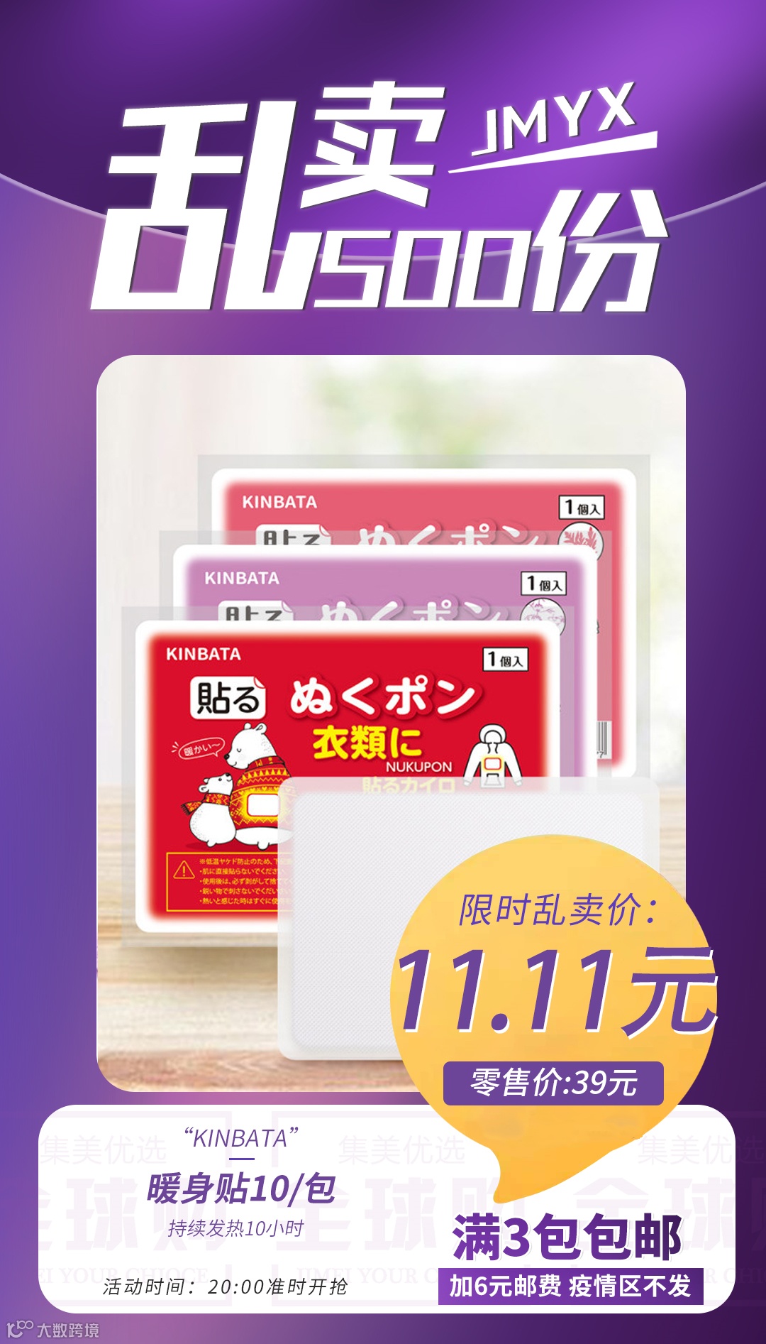 【粉丝群补贴·满3包包邮】KINBATA 暖身贴10/包 持续发热10小时 原价:39元 粉丝群补贴价:11.11元
