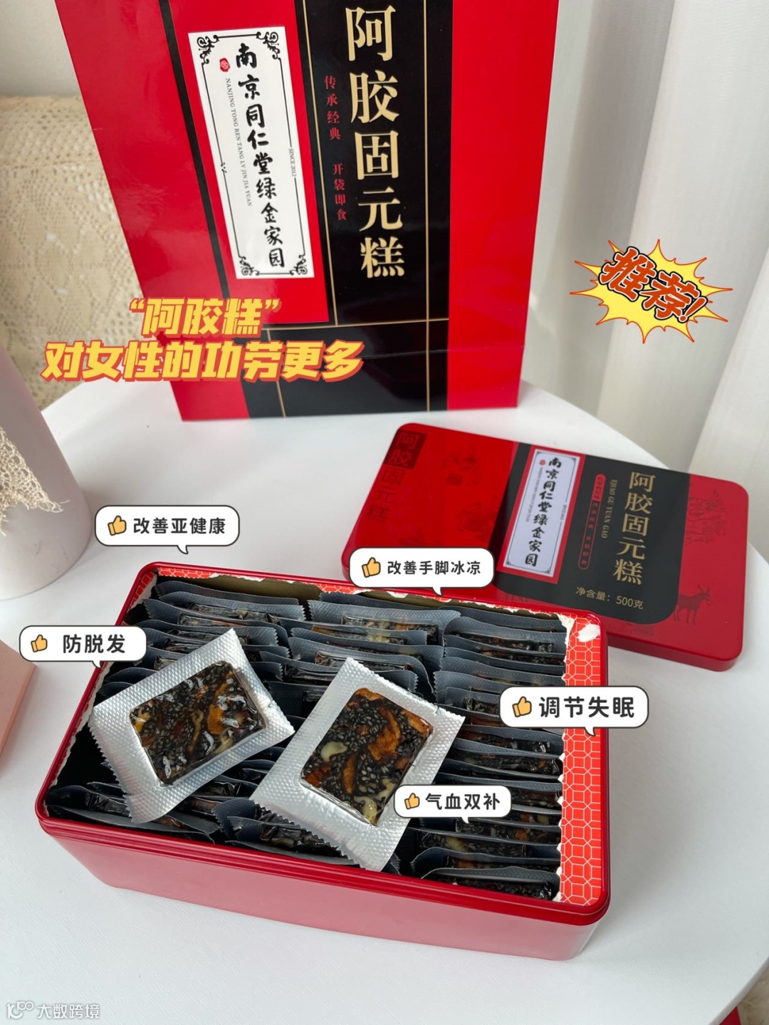 阿胶固元糕 补气补血 ,美容养颜,延缓衰老 调理内分秘,对痛经超有效 清肺润燥治咳嗽 ,增强免疫力 男女滋阴补肾 ,改善睡眠对高血压有扩张血管疗效,防治老年病健脑益智 .提高记忆力,抗幅射