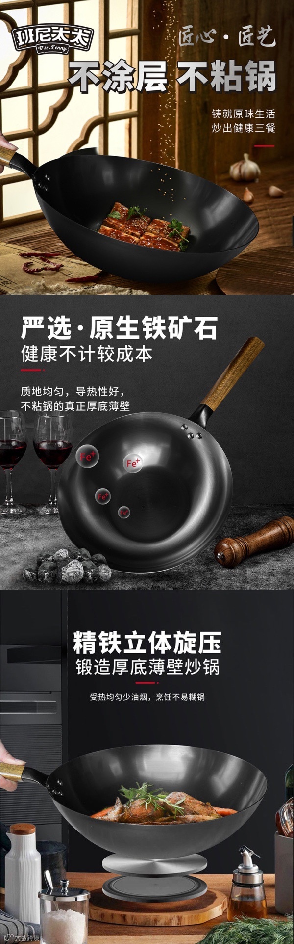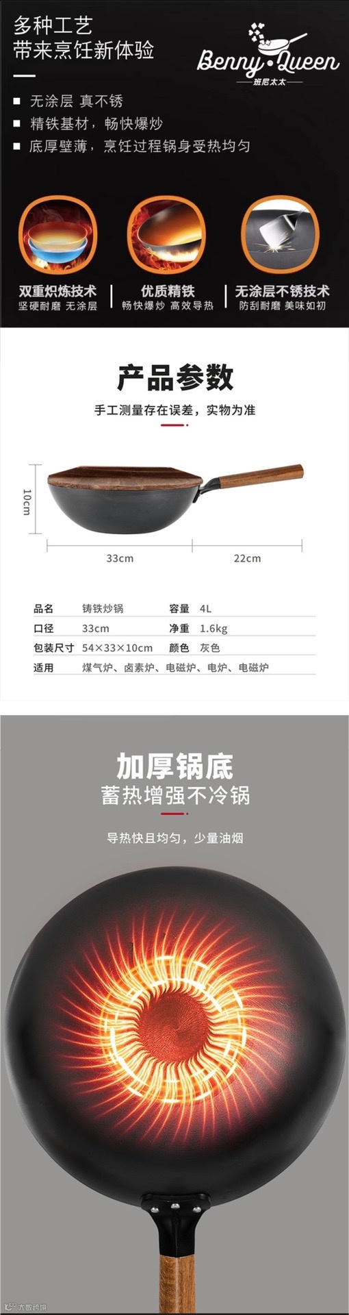 在铁锅表面没有任何涂层,防刮耐磨的基础上