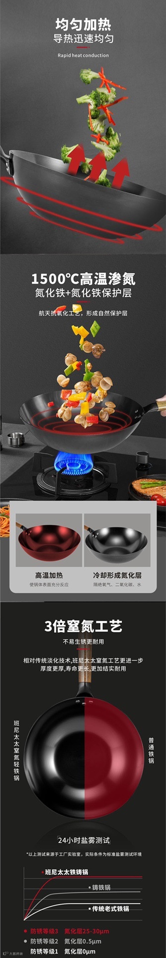 高纯度铁基材经过超高温特殊工艺处理,重整表面结构,进而达到持久不腐蚀的效果。确实意义上解决问题了困扰消费者多年的传统铁锅腐蚀难题,做到了身体健康补铁不食锈。