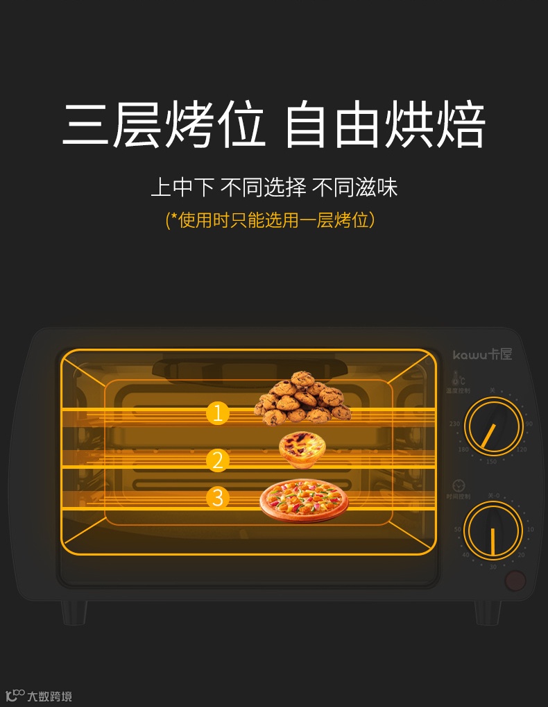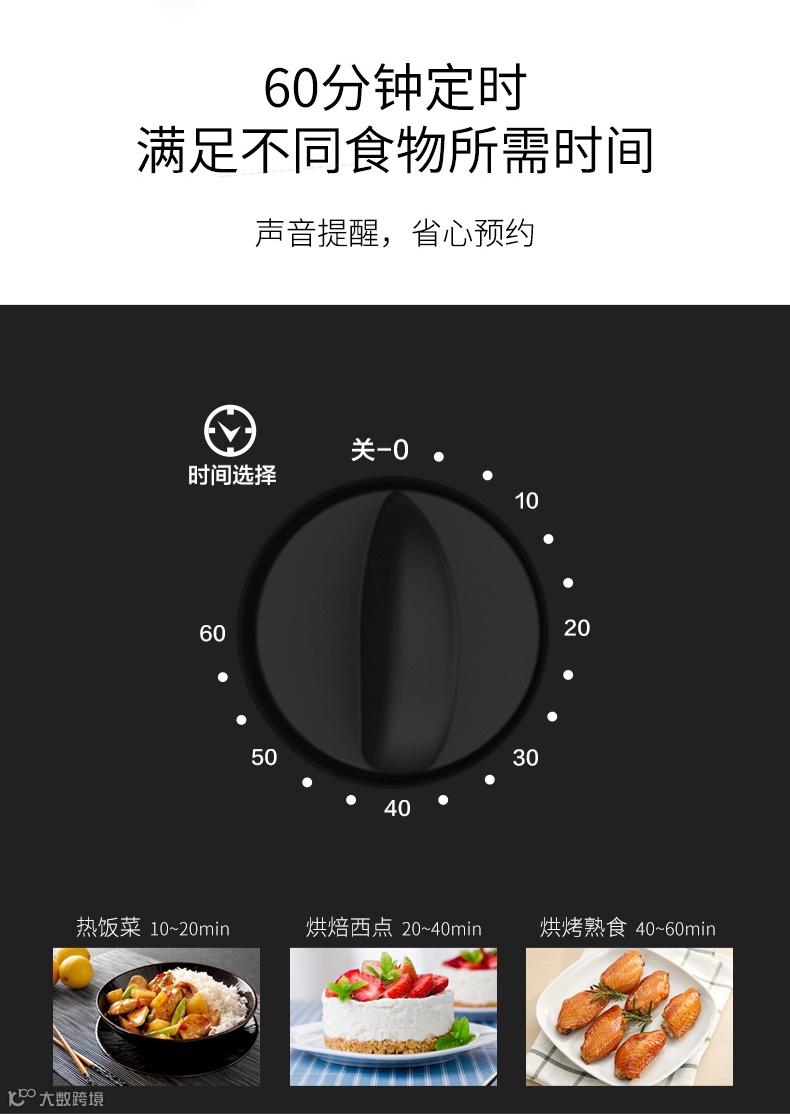 特点:三层自由烤位、小功率省电、便捷旋钮操控、60分钟定时设计