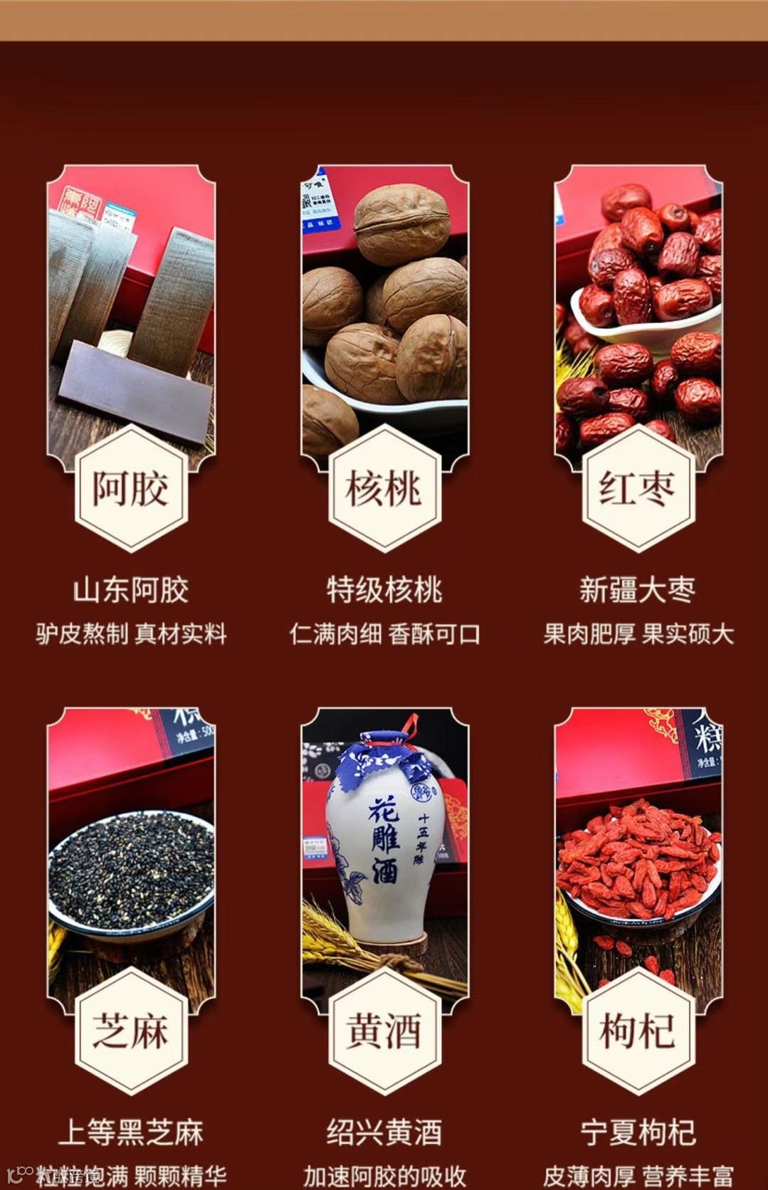 精选上等食材黑芝麻、核桃仁、阿胶、冰糖、黄酒、蛋白粉、红枣(添加量:>10%)、枸杞(添加量:≥2%),食材营养不流失,科学配比熬制,好吃又滋补