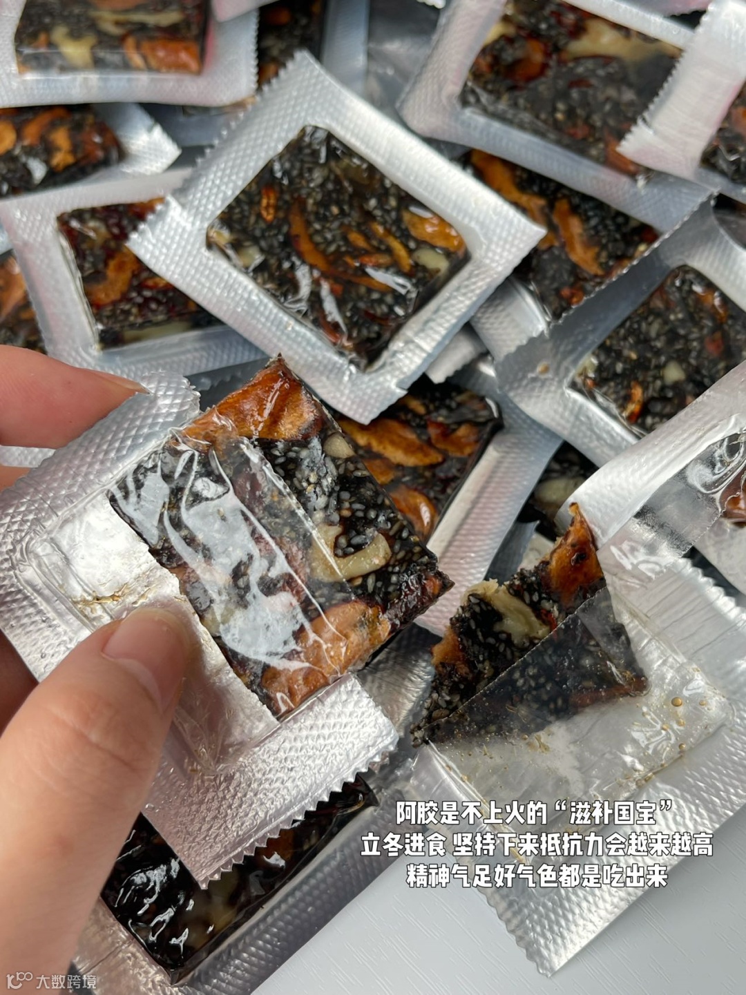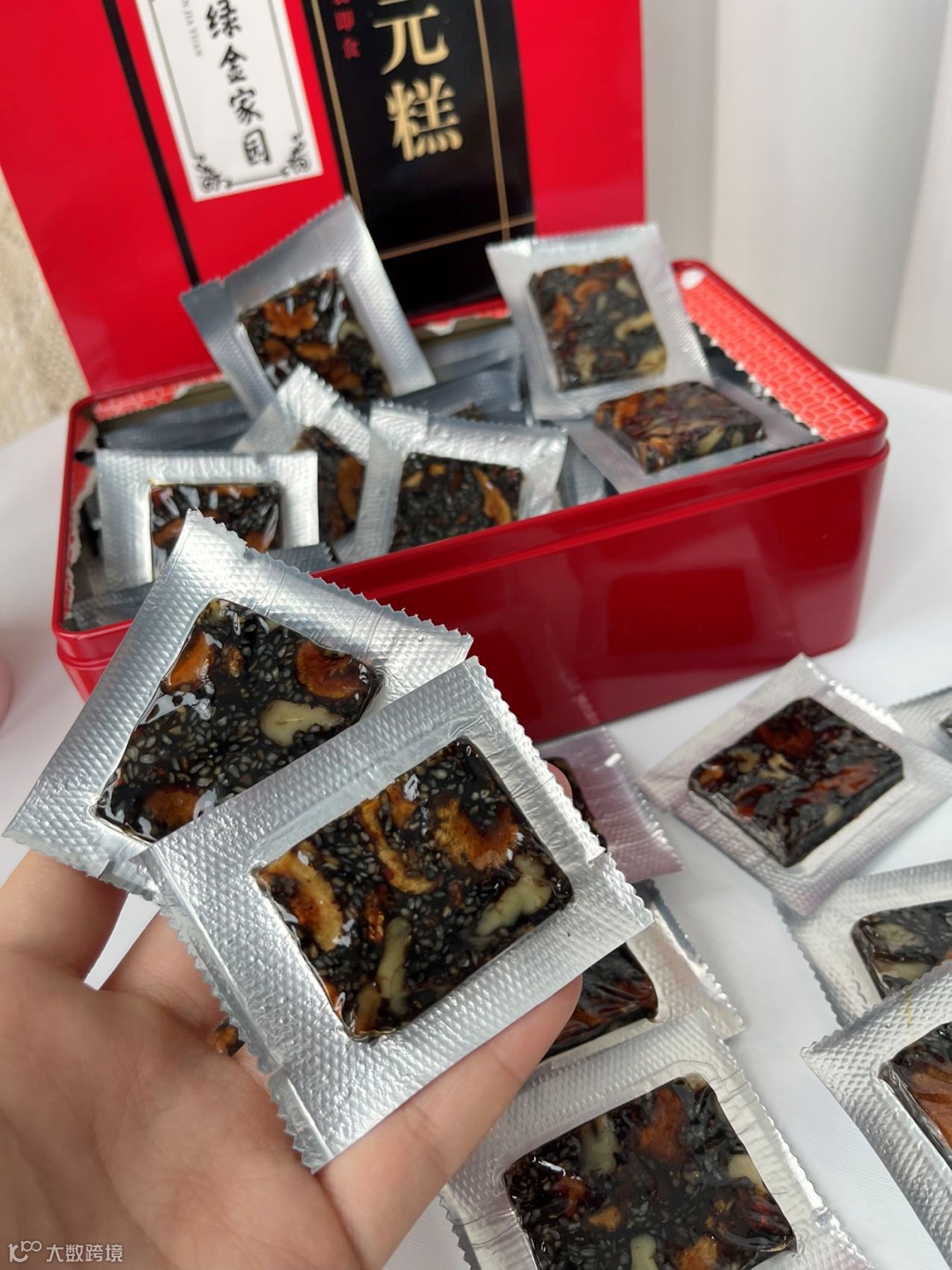 【配 料】黑芝麻、核桃仁、阿胶、冰糖、黄酒、蛋白粉、红枣(添加量:>10%)、枸杞子(添加量:≥2%) 、麦芽糊精、阿胶