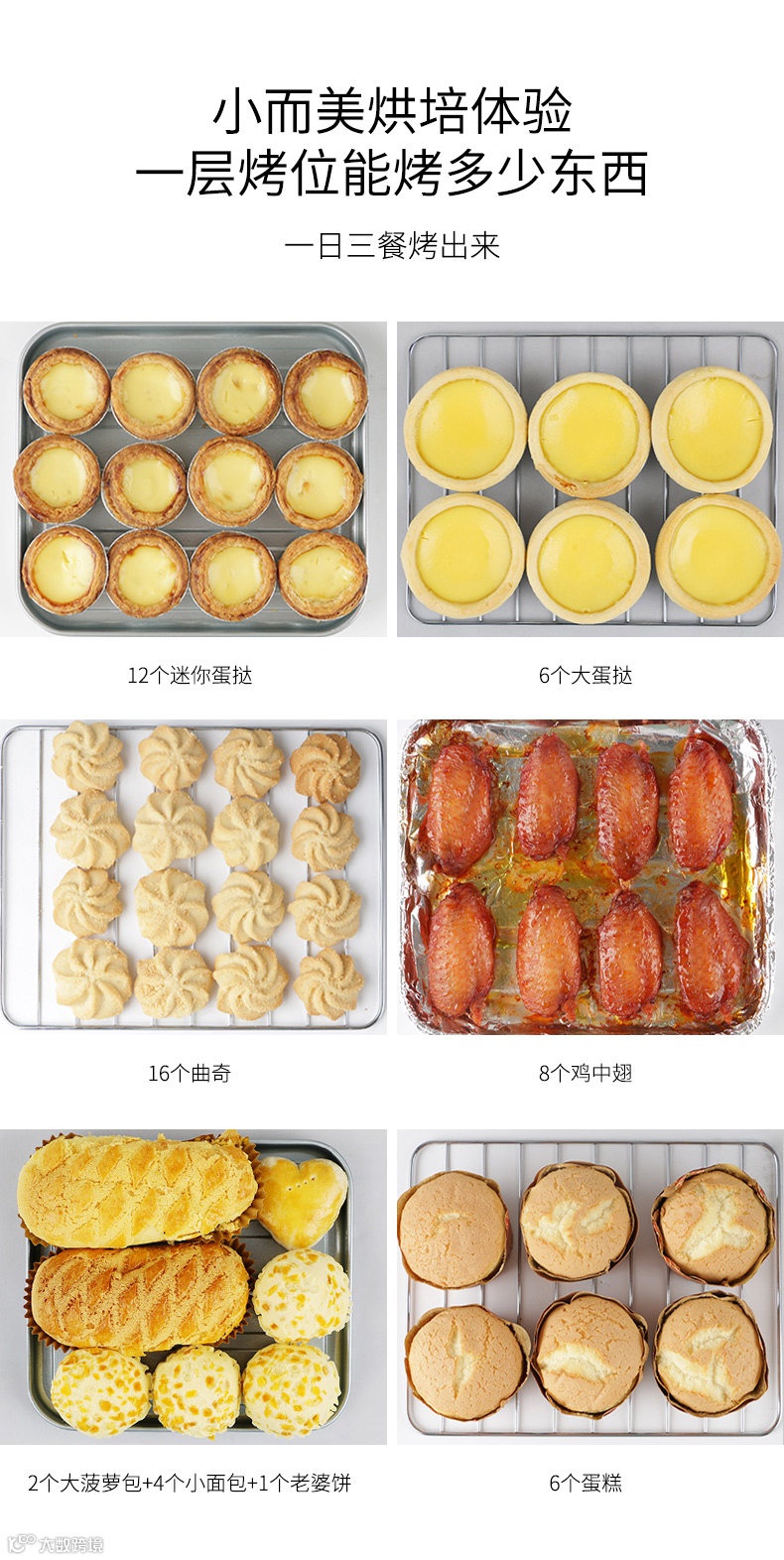 一次可以烤:6个大蛋挞、4个肉松面包、8个鸡中翅、6个杯子蛋糕、16个曲奇......单身贵族、情侣和三口之家完全够用。