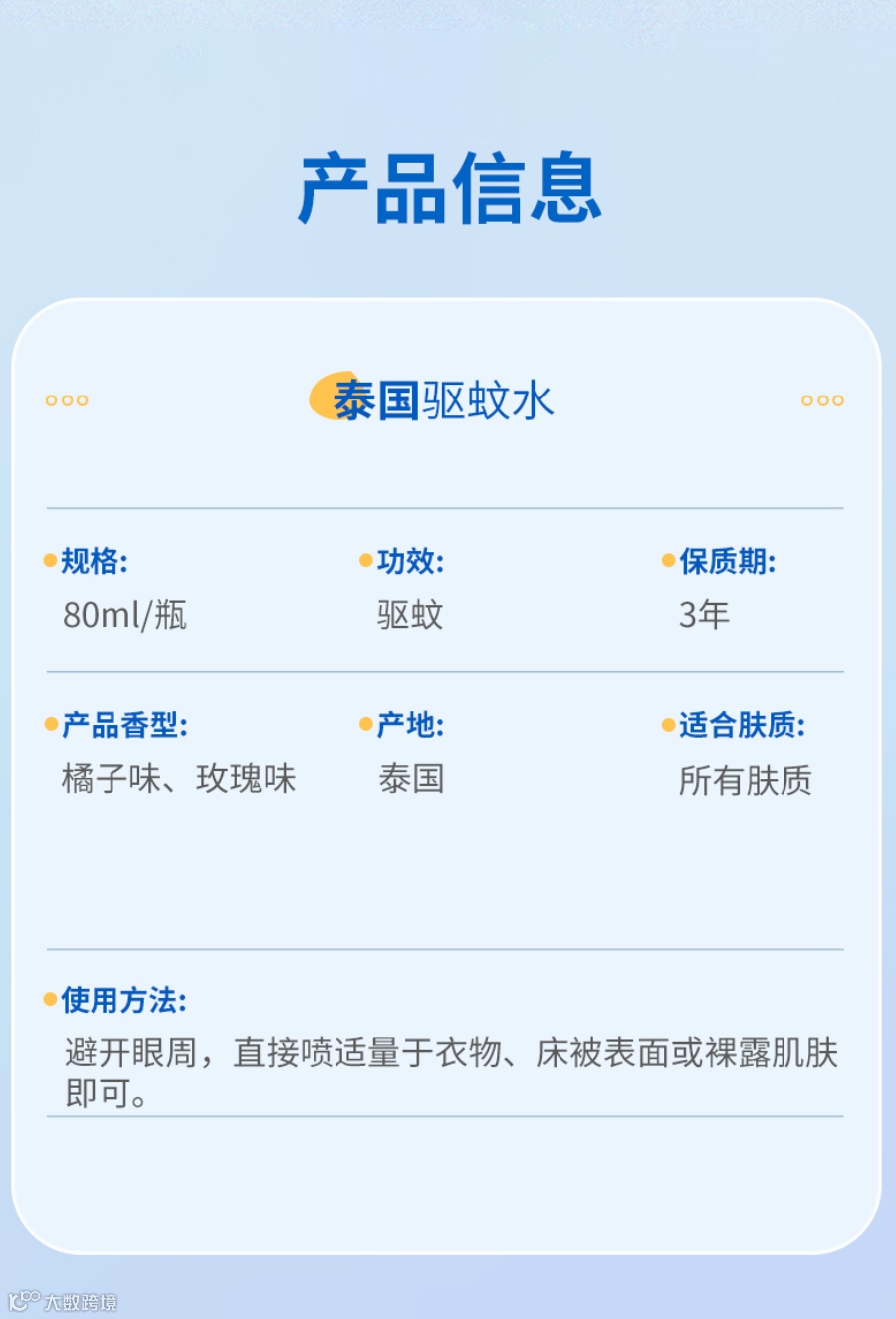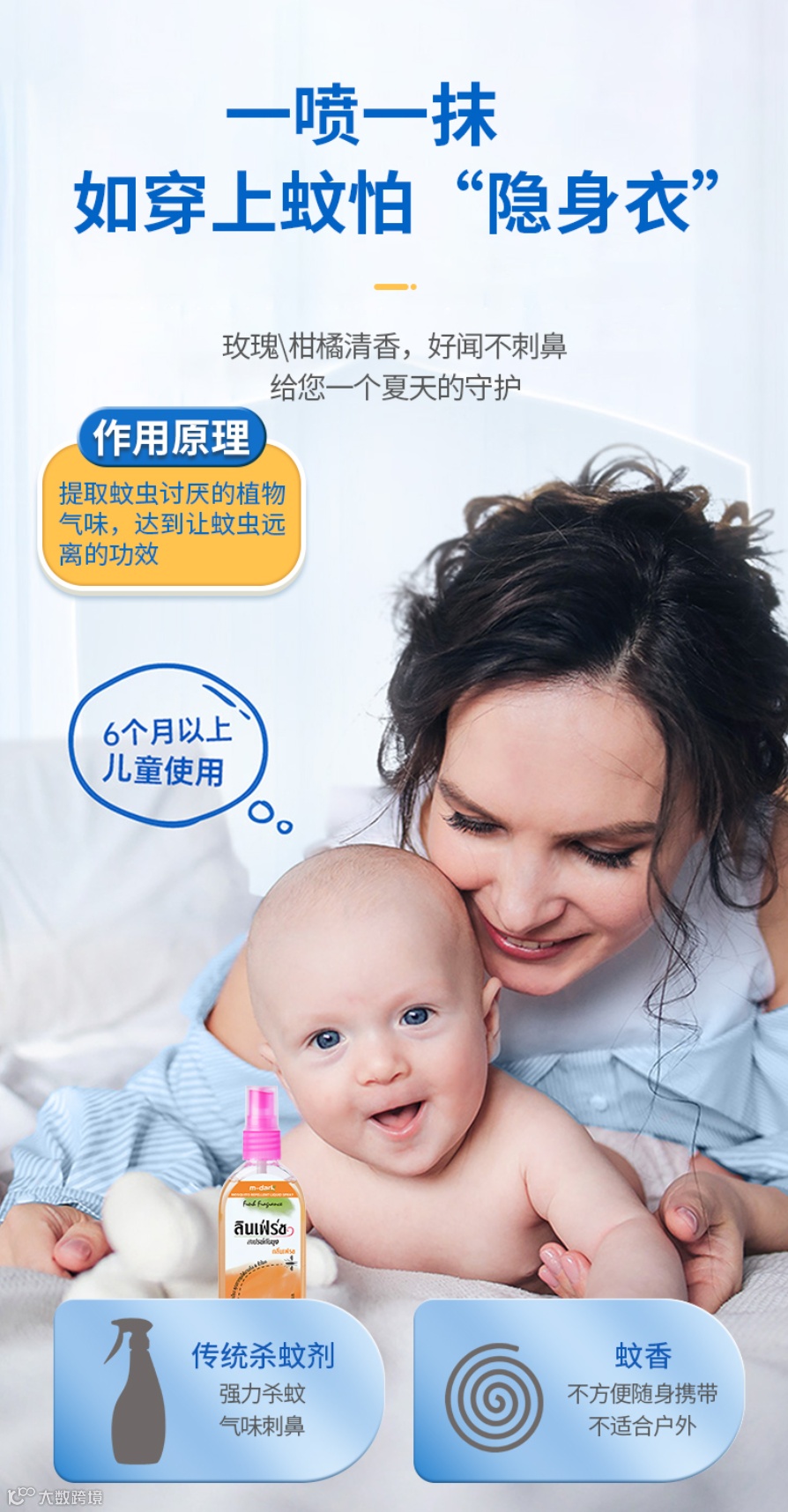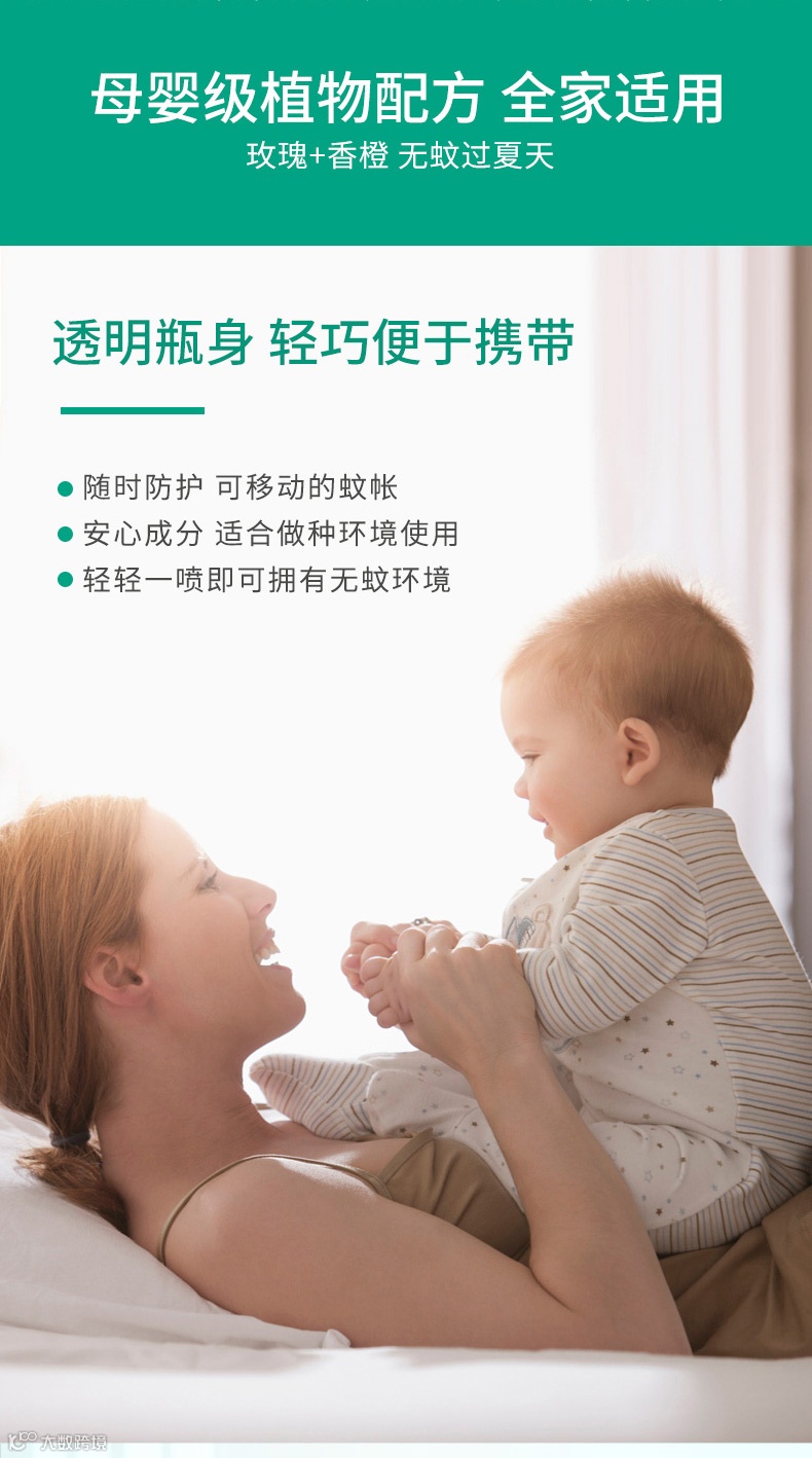 有效抵御蚊虫长达7小时,睡觉时喷在床的周围,去户外,喷在衣服上,蚊子害怕这个味道,淡淡的香一点不刺鼻,玫瑰&橘子两个味道,都很适合夏天~