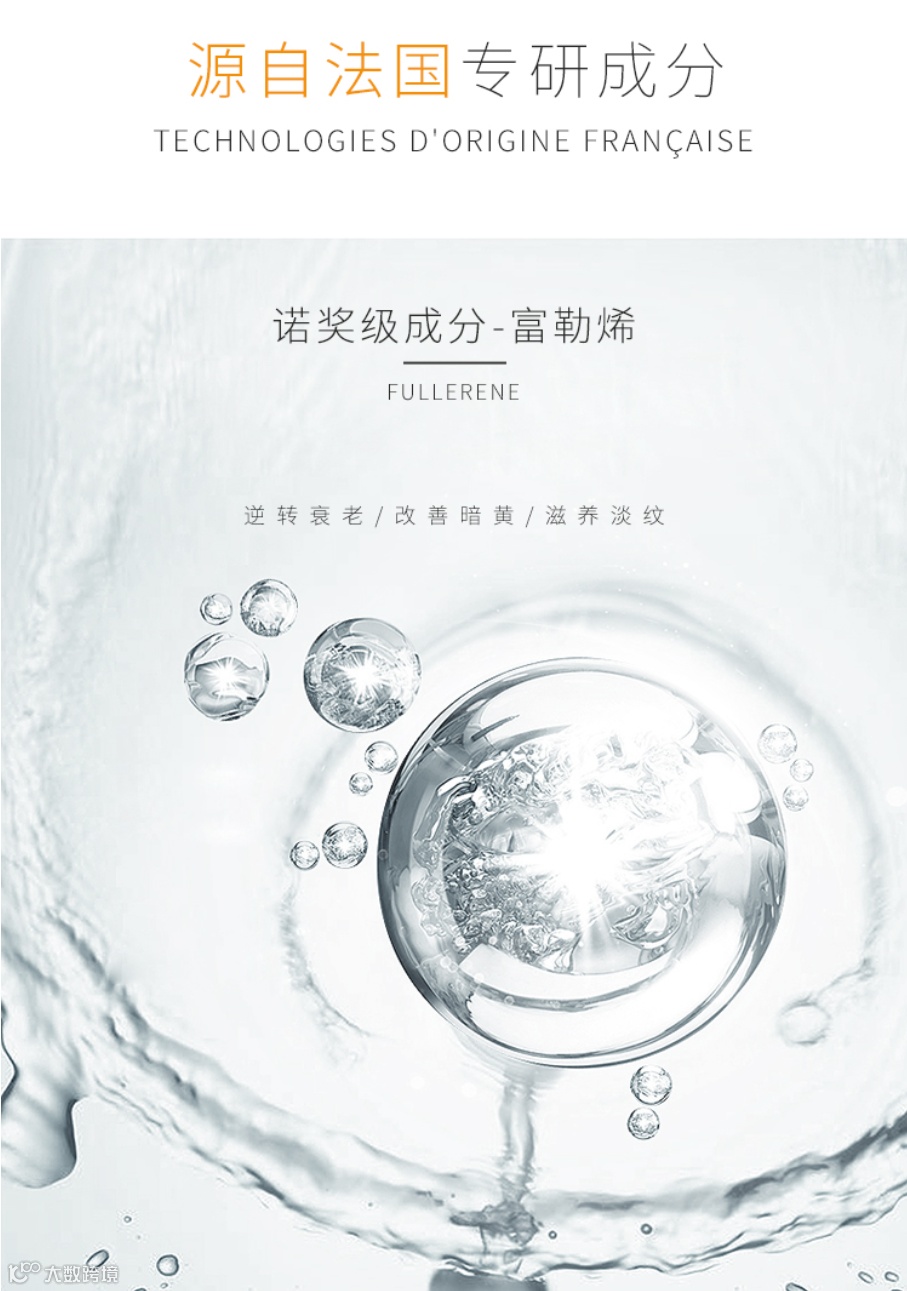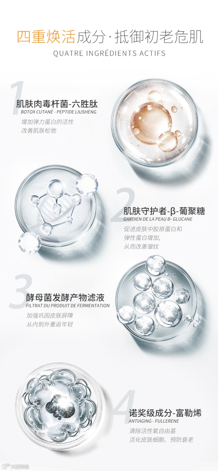 蕴含抗皱修活成分:富勒烯、六胜肽、葡聚糖、酵母菌发酵产物滤液等,淡化皱纹,紧致肌肤。