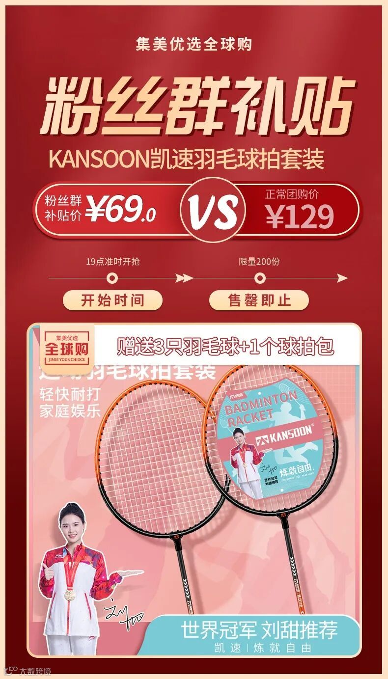 【粉丝群补贴】KANSOON凯速羽毛球拍套装(赠送3只羽毛球+1个球拍包) 原价:129元 粉丝群补贴价:69元