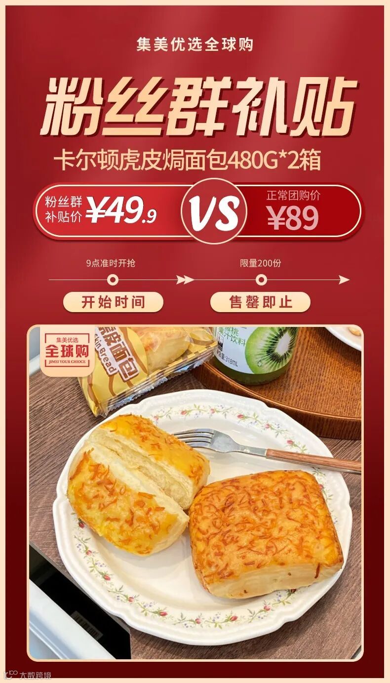 【粉丝群补贴】卡尔顿虎皮焗面包480g*2箱 保质期90天 原价:89元 粉丝群补贴价:49.9元