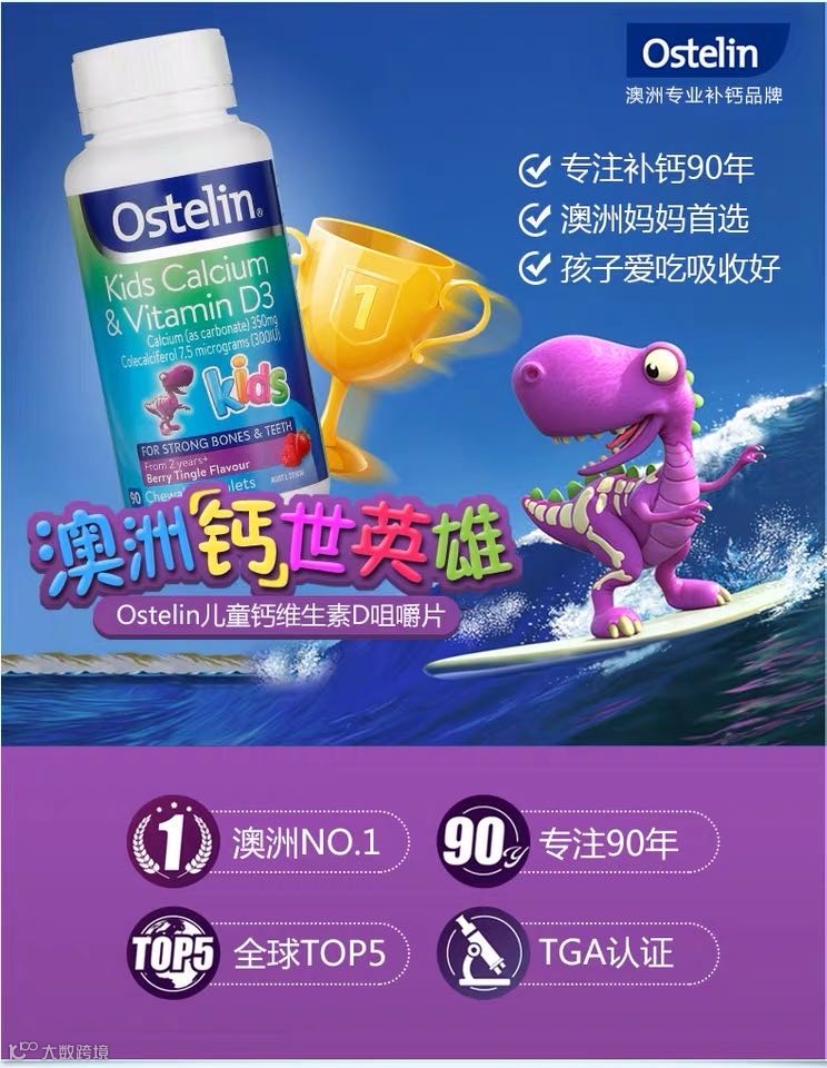 澳大利亚排名第一的维生素D和骨骼健康品牌 ,比(澳洲)市场上其他儿童维生素补充营养品含有更多的维生素D和钙 ,所含钙为儿童每日所需的钙摄入量,堪称“钙片中的爱马仕”,不含人造色素及香料 ,非常美味的梅子味咀嚼片。还有清真认证哦!