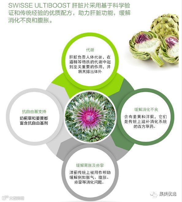 Swisse 护肝片中含有的St. Mary’s thistle(一种植物的冠)是传统肝脏补品,它能够保护肝脏健康,帮助重建肝脏细胞。排毒片中的另外一种主要成分朝鲜蓟能够缓解消化不良、胃胀气等症状。本品中还有姜黄,能够抵挡现在自由基对肝脏造成的伤害;历史上姜黄已经长期被用作抗炎、消炎之用。
