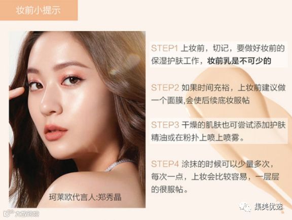 气垫粉与折射率较高的光泽油,双重立体效果,让肌肤散发自然透亮的光芒,缔造细腻纯净的自然妆效”