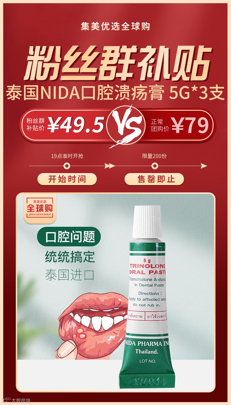 【粉丝群补贴】泰国Nida口腔溃疡膏 5g/支*3支 原价:79元 粉丝群补贴价:49.5元