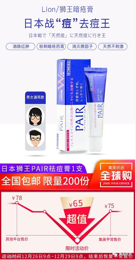 LION 狮王PAIR祛痘软膏是针对脸部暗疮和痘痘较多的人士设计,能快速消除开、闭口粉刺、退红抗炎,在日本有着极高的人气,同时是日亚粉刺治疗药排行第1名!温和不刺激,祛痘效果一夜就能感受到,真心管用!